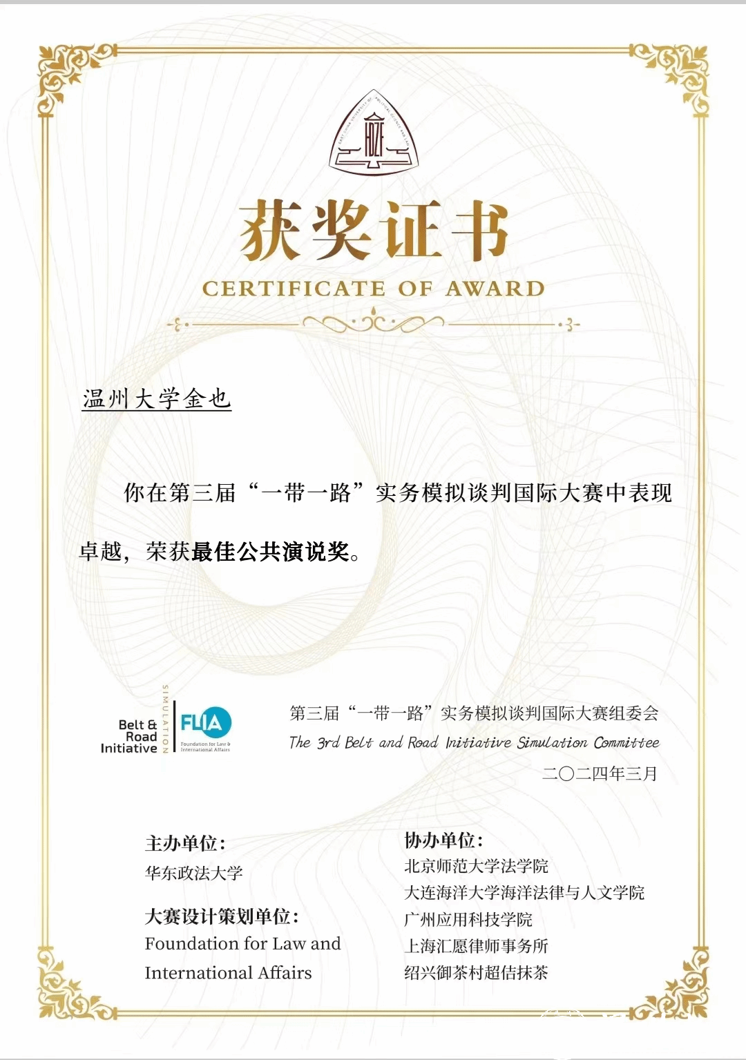 3月9-10日,第三届“一带一路”实务模拟谈判国际大赛落下帷幕。开云电子(中国)官方网站_开云电子(中国)官方网站代表队通过激烈角逐取得了团体三等奖,国际经贸规则专业22级学生金也因优秀的赛场表现荣获最佳公共演说奖,法学院国际法系李娟老师荣获最佳教练奖,共获3项奖项。