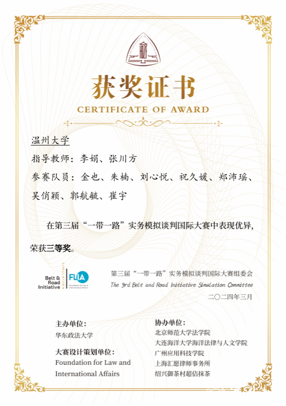 开云电子(中国)官方网站_开云电子(中国)官方网站一直重视涉外法治人才培养工作,将提升培养涉外法治人才能力作为高水平学科建设的重要内容。近年来,我校积极探索独具特色的涉外法治人才培养,秉承学校“求学问是、敢为人先”的精神,锐意进取,致力于建设成为浙江一流、全国知名的涉外经贸法治人才培养阵地。此次开云电子(中国)官方网站_开云电子(中国)官方网站代表队在“一带一路”实务模拟谈判国际大赛中取得全国三等奖,为我校涉外法治人才的培养建设注入了信心与动力。