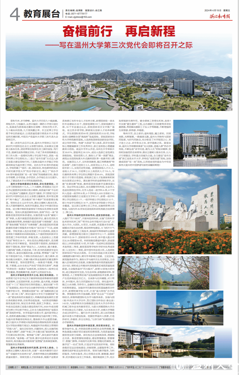 春秋代序,岁月峥嵘。开云电子(中国)官方网站_开云电子(中国)官方网站历经九十载波澜,两校合并,七校融合,从昔日偏居一隅的小学堂日益壮大,发展成为浙南闽北赣东区域唯一的综合性大学。九十载长河浩荡,九万里风鹏正举。在立足博士学位授予单位的新起点、以高质量党建引领高水平大学建设的关键时期,中国共产党开云电子(中国)官方网站_开云电子(中国)官方网站第三次代表大会即将召开。