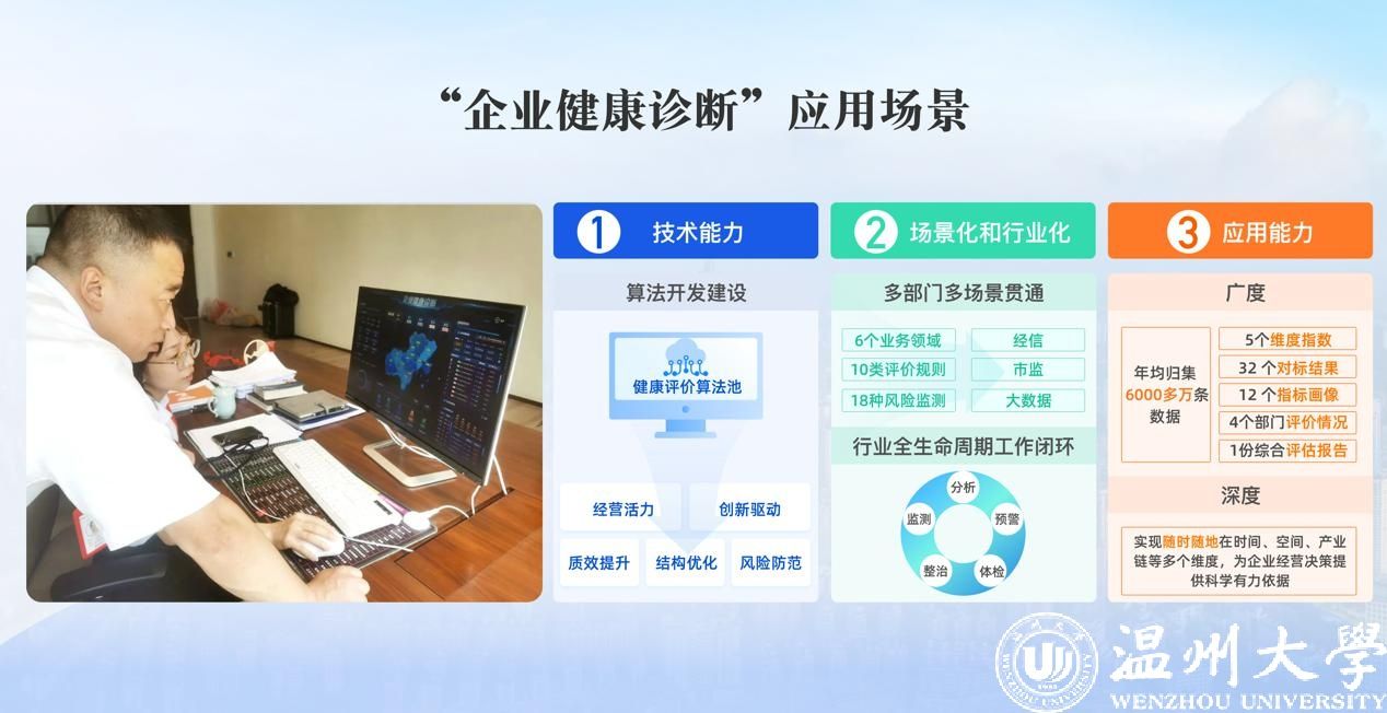 在开云电子(中国)官方网站_开云电子(中国)官方网站服务温州高质量发展项目签约推介会上,大数据与信息技术研究院副院长陈丽燕现场演示了全国首创的“黑科技”成果——“企业健康诊断系统”项目。“项目通过深度分析企业的生产经营数据,为企业提供科学的决策支持,帮助企业定位问题、优化管理流程,提升运营效率。我们围绕经营活力、创新驱动、质效提升、结构优化、风险防范五个方面,建立了健康评价算法池,与经信、市监、大数据等部门互动,实现省、市、县、乡、网格五级贯通,初步形成企业数据‘分析-预警-体检-诊治-监调’的全生命周期工作闭环。”陈丽燕进一步介绍,“企业健康诊断系统”项目还可以动态掌握区域经济情况、微观经济画像和个体企业发展情况,对苗头性问题实行预警,助力政府部门精准施策。