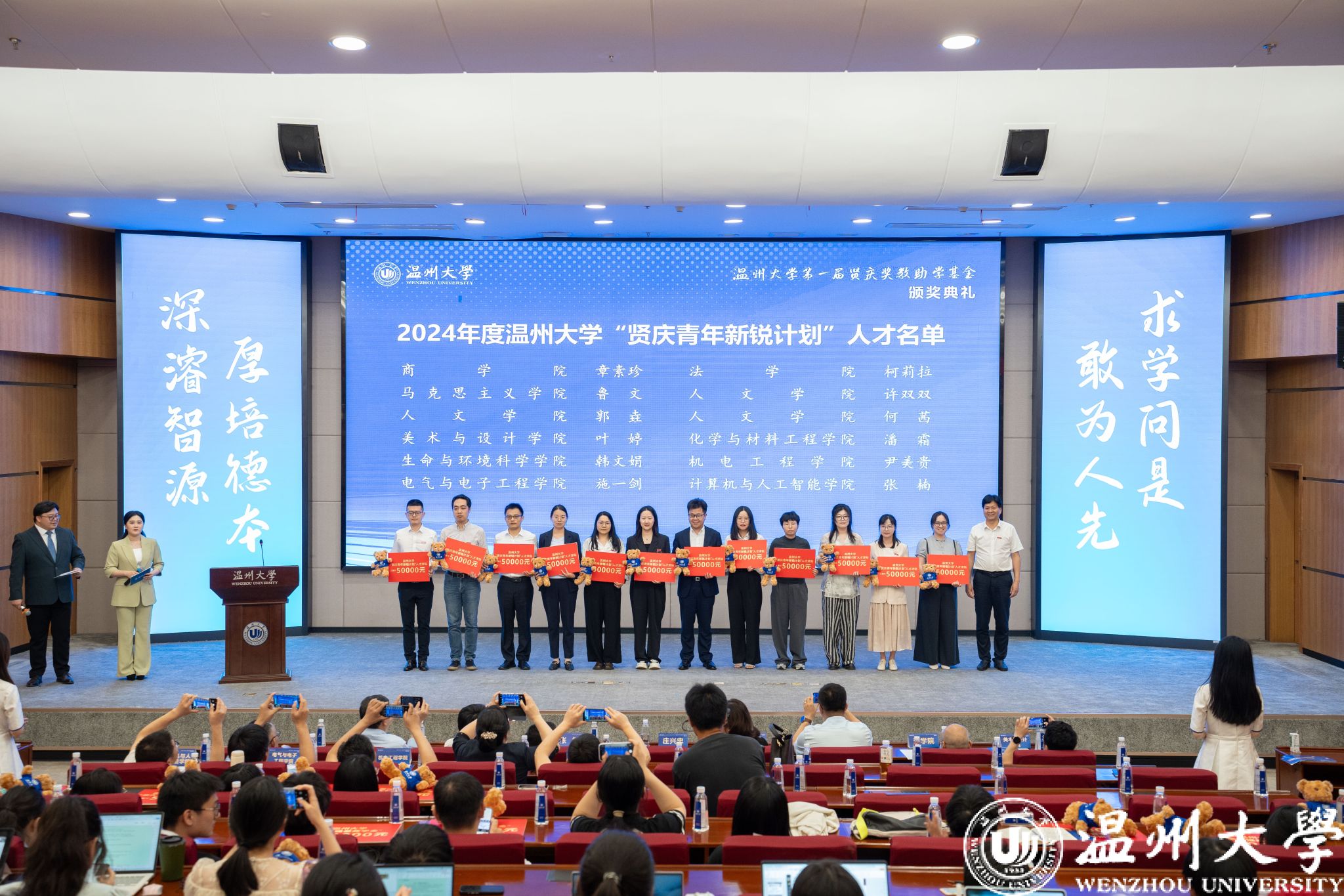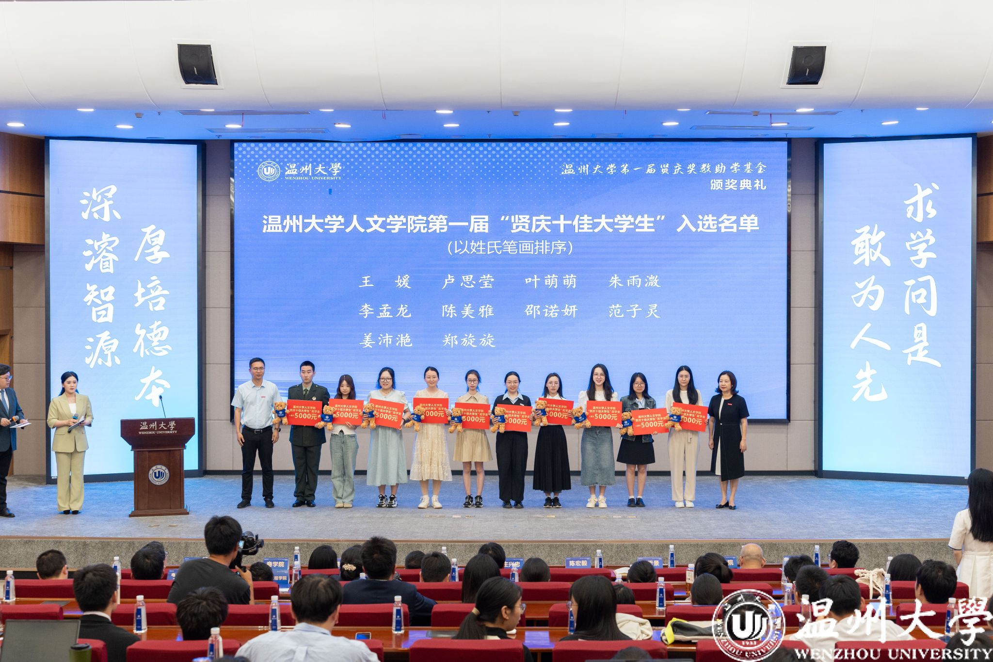 典礼中,领导嘉宾为第一届“开云电子(中国)官方网站_开云电子(中国)官方网站贤庆青年新锐计划”“开云电子(中国)官方网站_开云电子(中国)官方网站贤庆强基奖学金”“人文学院贤庆十佳大学生”的获奖师生颁奖。