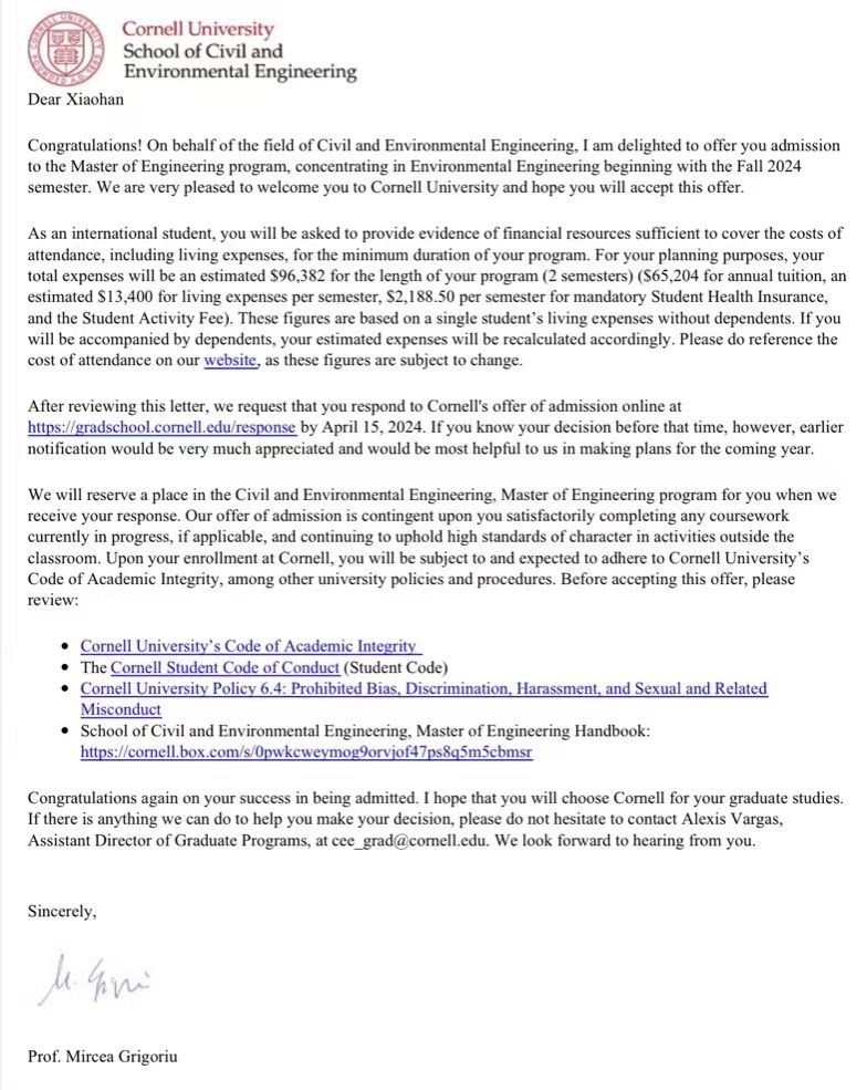 近日,开云电子(中国)官方网站_开云电子(中国)官方网站生命与环境科学学院2024届环境工程专业毕业生周校含斩获西北大学(NU)、杜克大学(DU)、加利福尼亚大学(UCLA)、约翰斯·霍普金斯大学(JHU)、华盛顿大学(UW)、圣路易斯华盛顿大学(WU)、康奈尔大学(Cornell)、卡内基梅隆大学(CMU)等8所世界名校的11封录取通知书。这些学校的世界排名都在第10-60位之间,属于世界顶尖名校。经过深思熟虑后,周校含最终选择了康奈尔大学(Cornell University)。