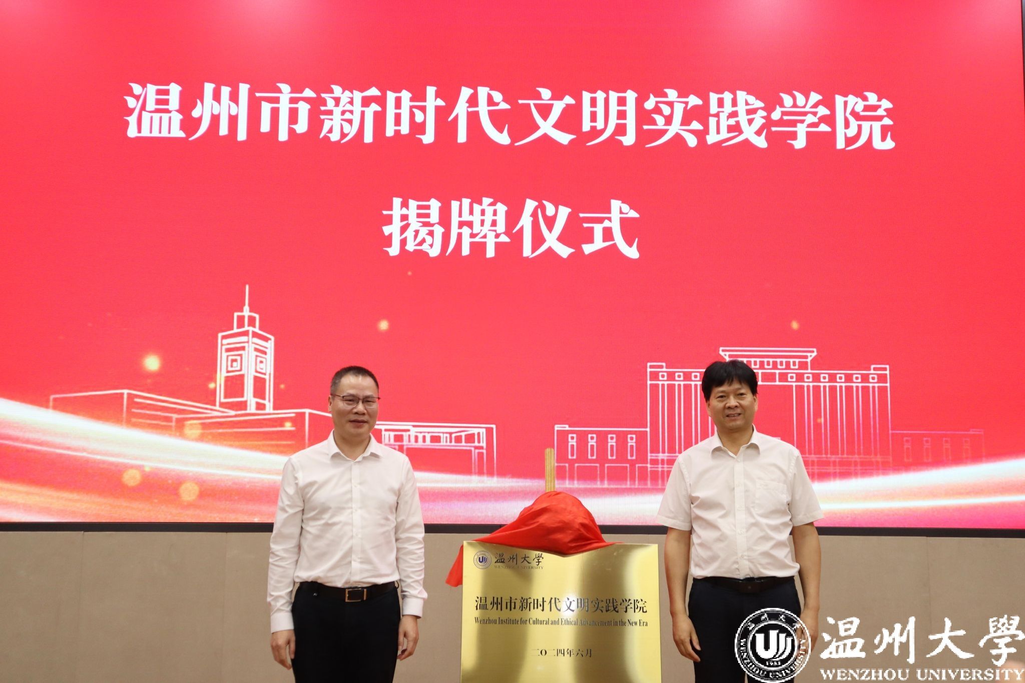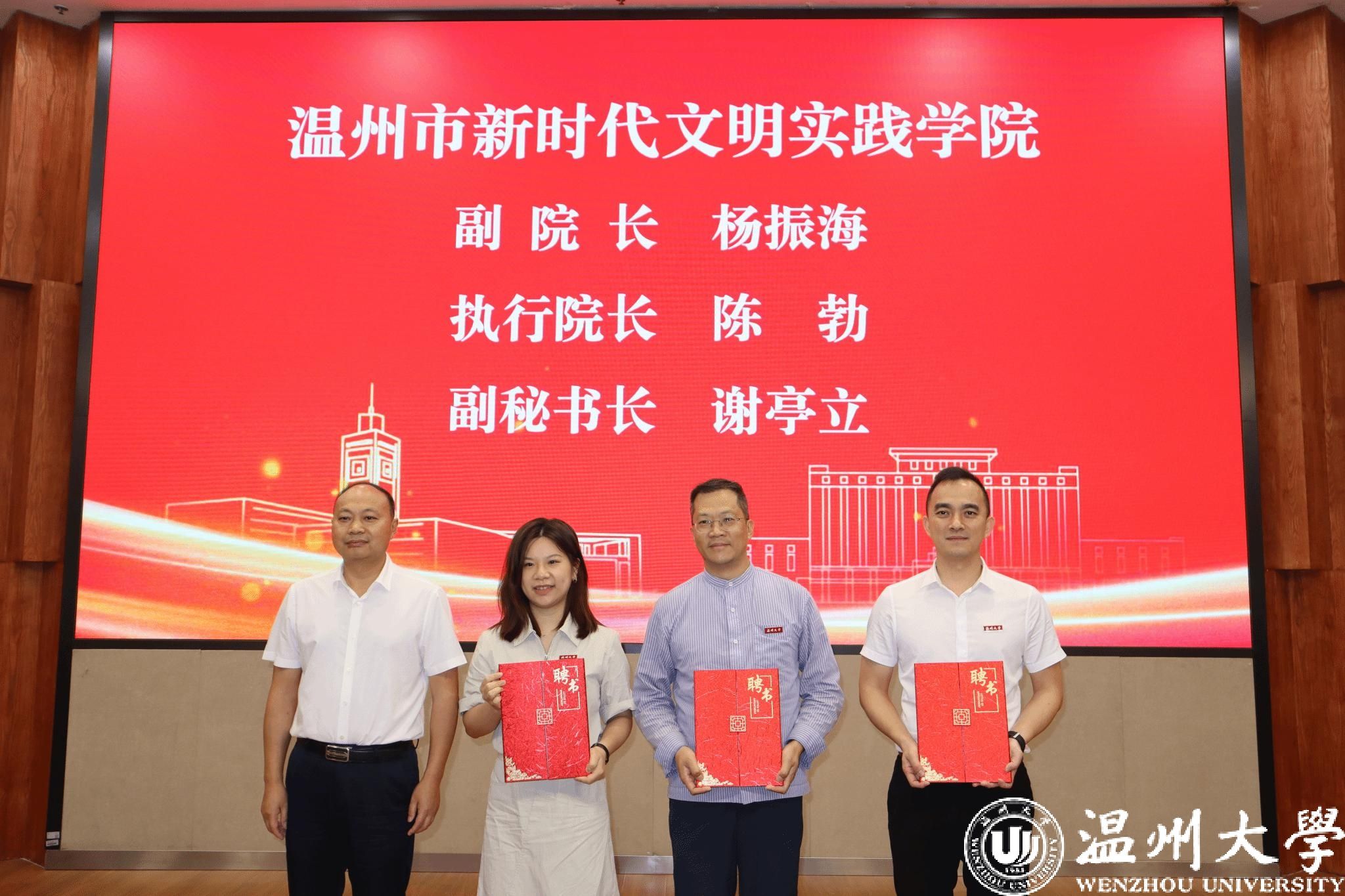6月18日上午,温州市新时代文明实践学院揭牌暨2024年新时代文明实践中心(所、站)专兼职人员第一期教学交流班开班仪式在我校举行。市委宣传部副部长、市文明办主任、市文明中心主任沈林杰,校党委副书记庄兴忠等领导出席。
