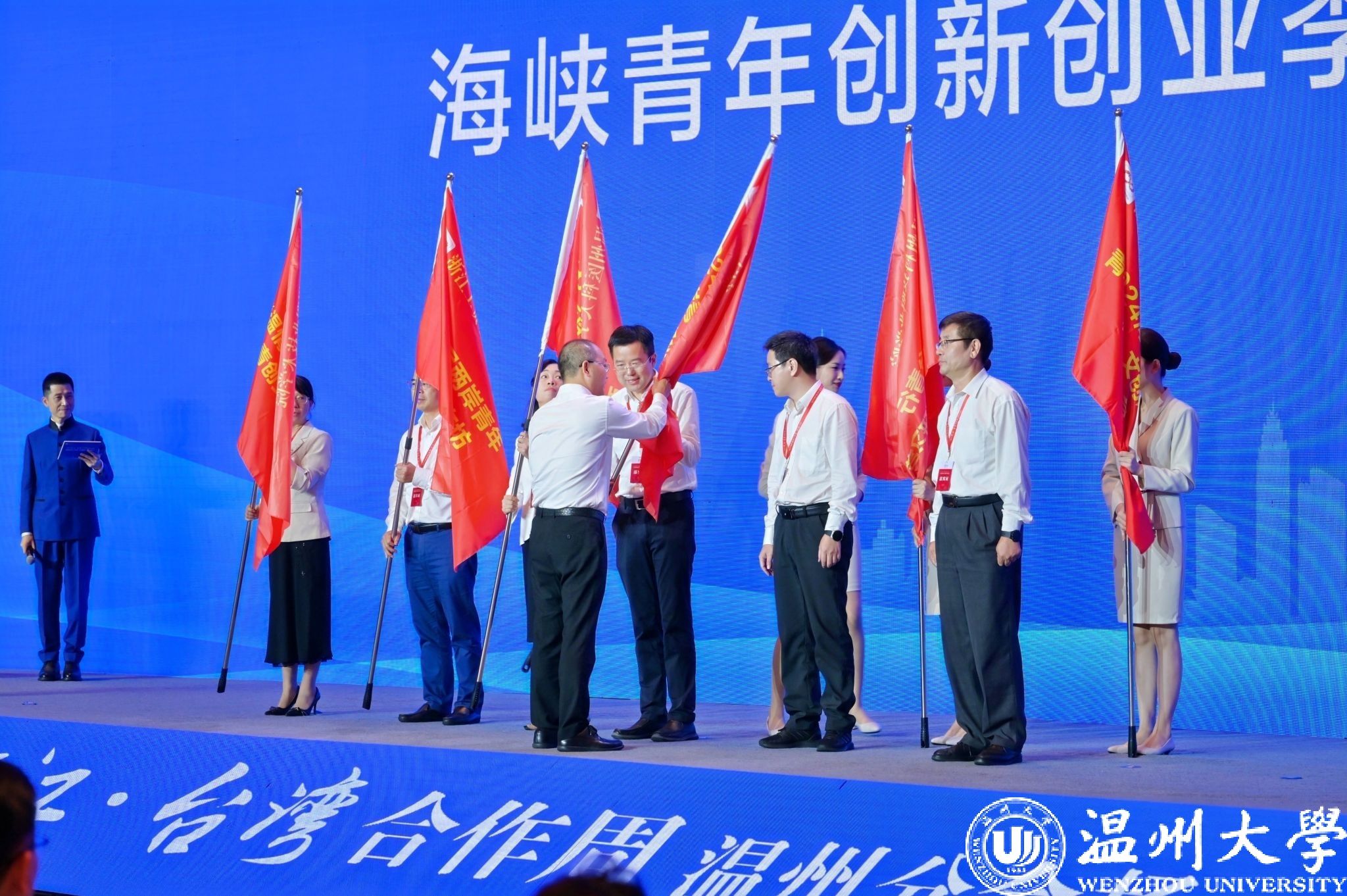 海峡两岸(温州)大健康产业对接会上,举办了“筑梦温州”海峡青年创新创业季启动仪式。温州市副市长陈宽为在温高校代表授“2024海峡两岸青年“瓯·文创之旅”暑期研学营”营旗。我校作为在温高校代表之一,由副校长王尧骏接旗。