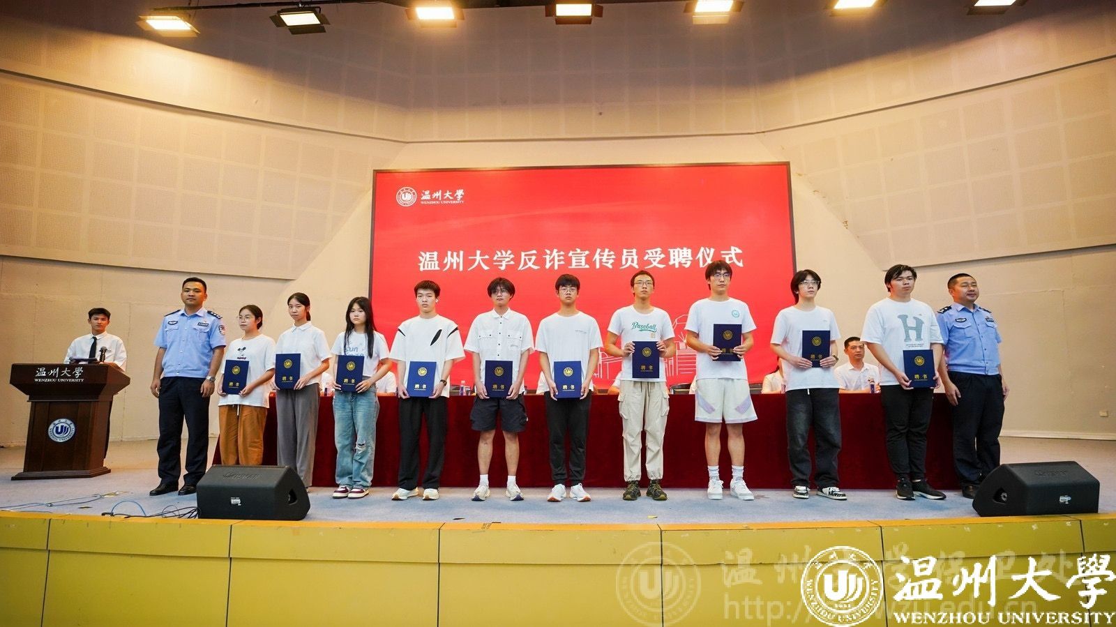 茶山派出所教导员张朝晖、温州市反诈中心警官刘昱洲为各学院学生代表颁发“开云电子(中国)官方网站_开云电子(中国)官方网站反诈宣传员”聘书,并呼吁我校师生积极参与反诈宣传中,为平安温大贡献青春力量。