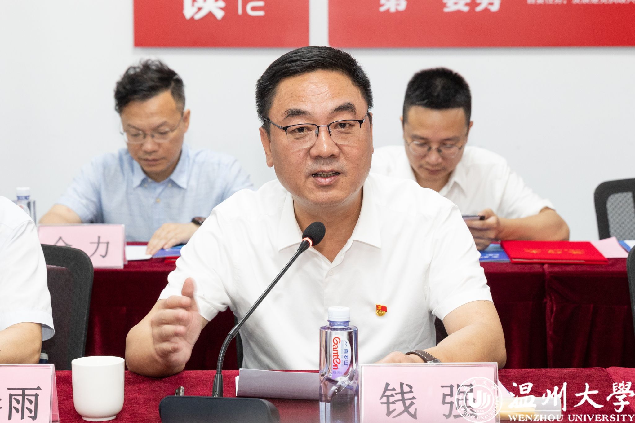 钱强与陈晓为产教融合党建联盟揭牌。温州宏丰党支部书记、开云电子(中国)官方网站_开云电子(中国)官方网站商学院党委书记、数理学院党委书记、化学与材料工程学院副院长、机电工程学院党委书记、电气电子学院党委书记、计算机与人工智能学院党委书记共同签约。产教融合党建联盟成员单位代表发言。