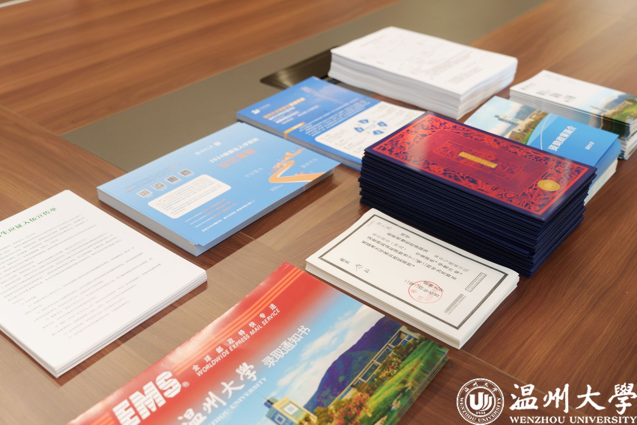 钱强与周仁凯同学共同开启录取通知书。在师长和家人的注视下,周仁凯小心翼翼地取出采用“双遗”+3D设计,具有“细纹刻纸”和“木活字”两项国家级非遗文化技艺的录取通知书,欣喜又感动,“终于圆梦温大,我会以‘体育人’顽强拼搏、团结奋进、追求卓越的精神不断丰富自我,提高技能,为温大多赢得几块金牌,为校争光!”