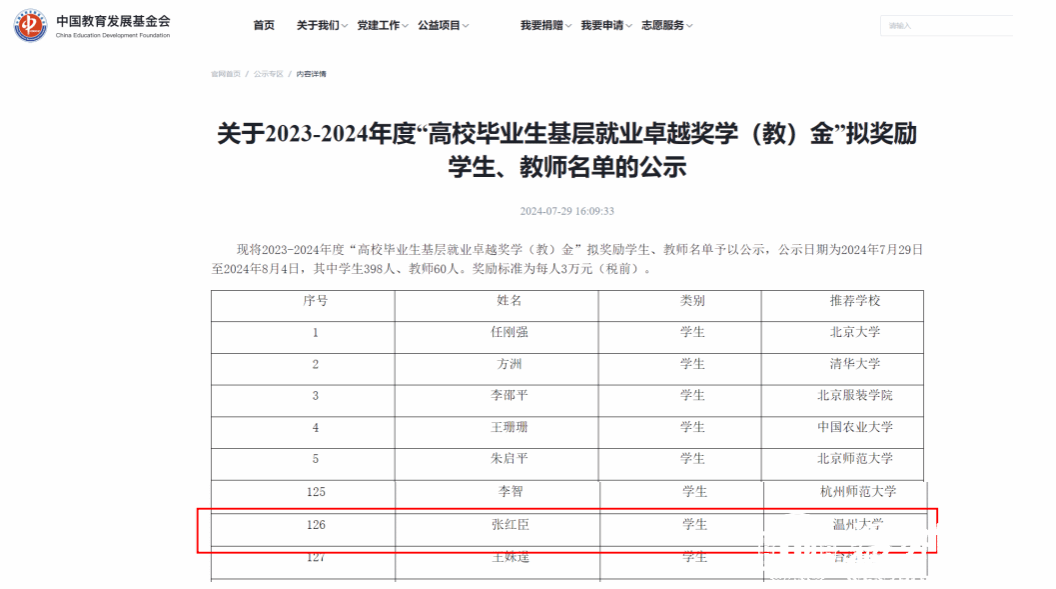 “全国高校毕业生基层就业卓越奖学(教)金”由教育部高校学生司(高校毕业生就业服务司)、教育部学生服务与素质发展中心共同指导,中国长江三峡集团有限公司出资,中国教育发展基金会设立,主要奖励赴基层就业并做出突出业绩的普通高校毕业生和普通高校指导服务大学生赴基层就业工作有突出贡献的教师。该项目每年遴选一次,今年全国共选拔398名毕业生。