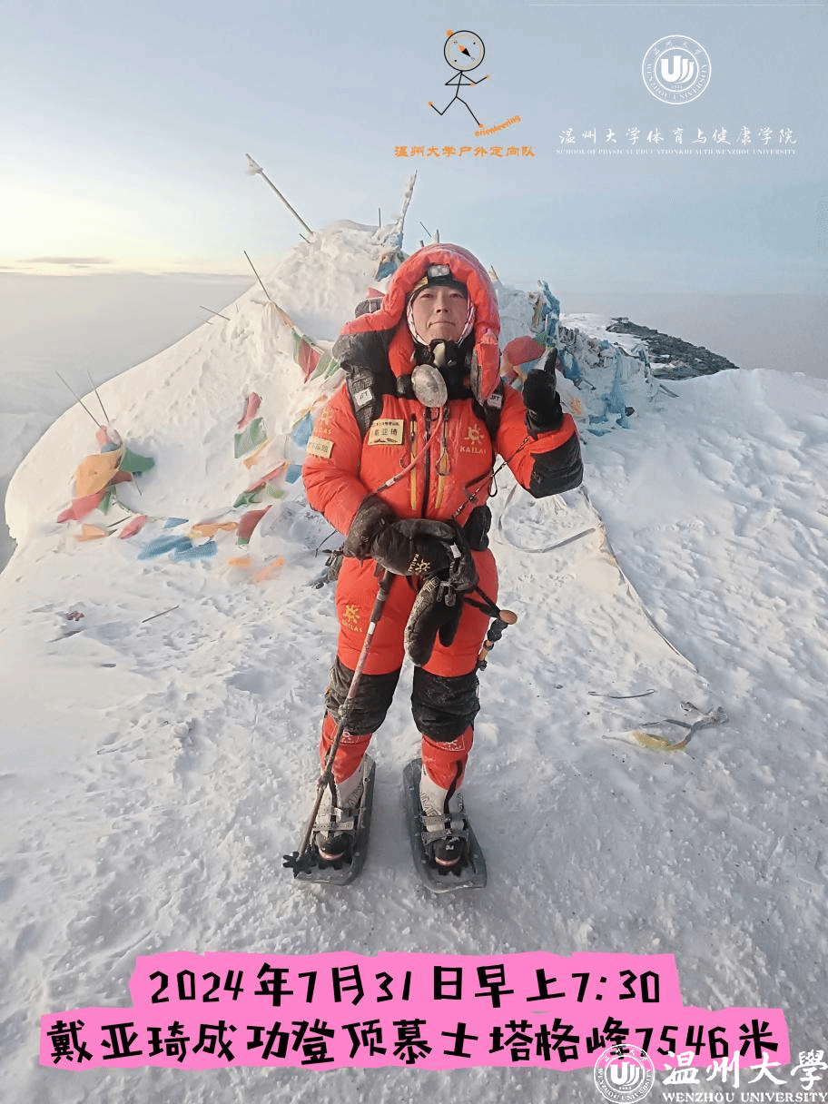 近日,我校体育与健康学院10级校友戴亚琦,成功登顶海拔7546米西昆仑山三大主峰之一的慕士塔格峰,获“国家一级登山运动员”称号、2023级研究生欧成成代表温州市登山协会受邀参与格尔木“礼赞七十年 铸就新辉煌”——格尔木庆祝海西蒙古族藏族自治州成立70周年暨“奋进七十载·勇攀新高度”大学生玉珠峰登山培训活动,成功登顶海拔6178米玉珠峰北线。