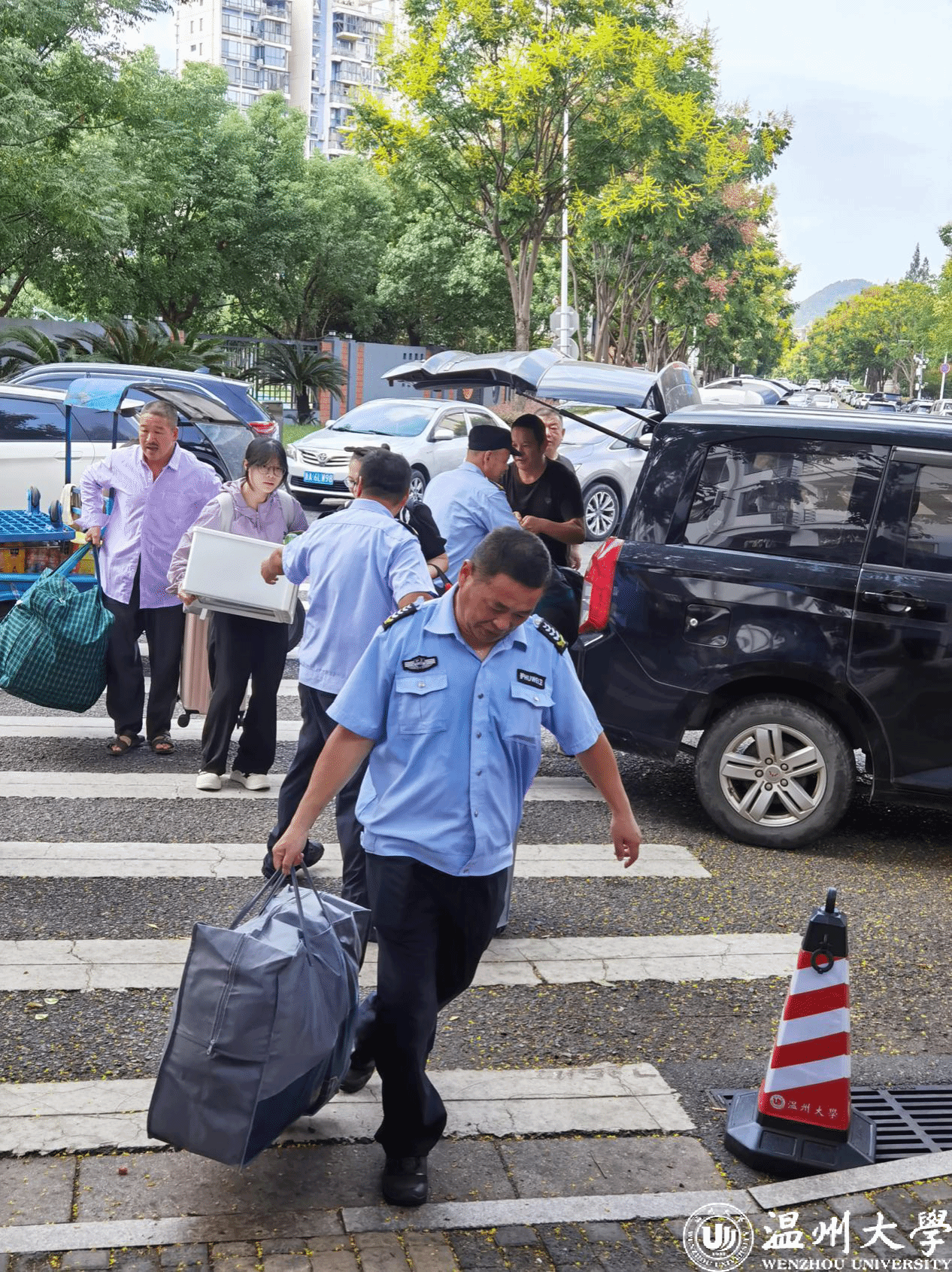 “你好!新同学”,温馨的标语横幅让新生和家长们倍感亲切和温暖。顶着烈日,安全保卫部工作人员笑迎每一位新生,为大家保驾护航,科普安全知识。