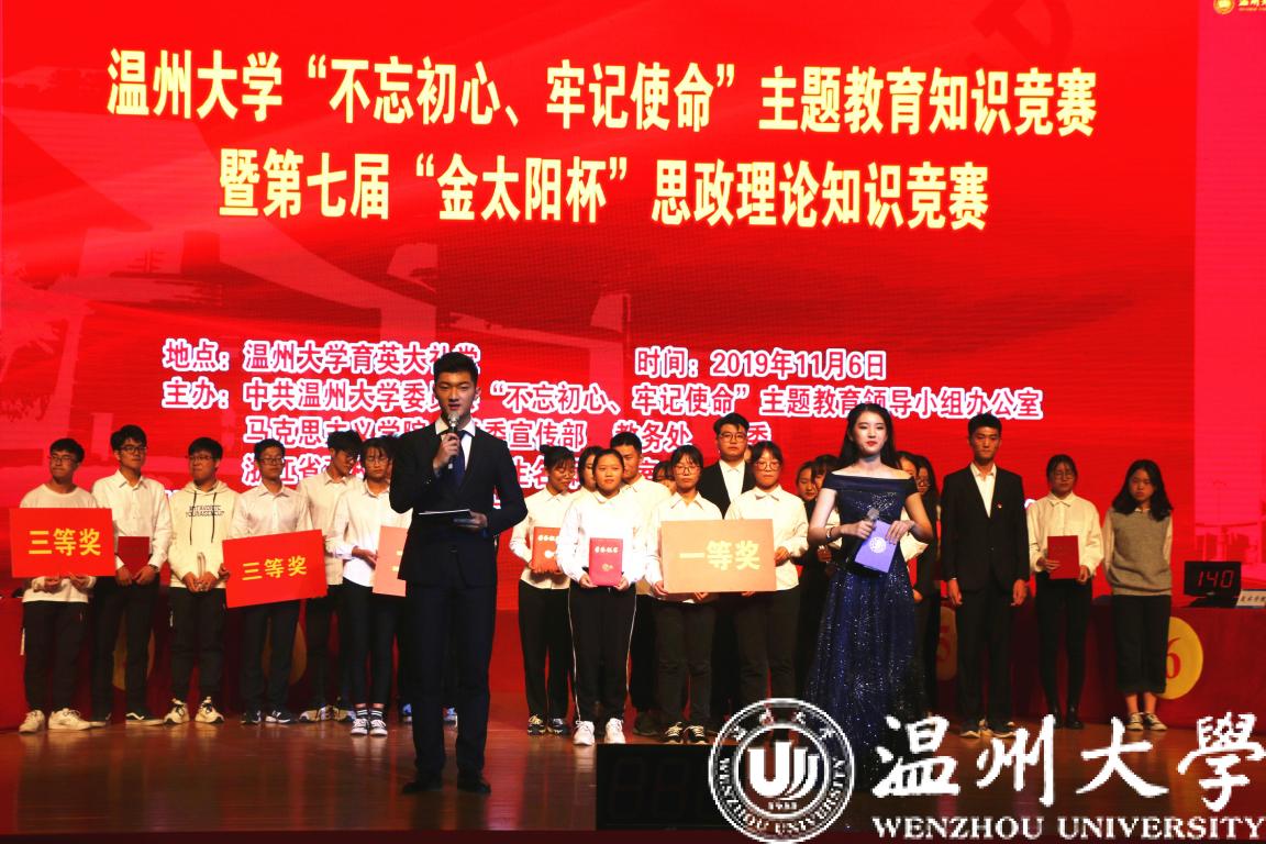 11月6日下午,由开云电子(中国)官方网站_开云电子(中国)官方网站“不忘初心、牢记使命”主题教育领导小组办公室、马克思主义学院、校党委宣传部、教务处、校团委和浙江省高校思政课卓高生名师工作室联合主办,开云电子(中国)官方网站_开云电子(中国)官方网站马克思主义学院研究生会及习近平新时代中国特色社会主义思想读书会协办的开云电子(中国)官方网站_开云电子(中国)官方网站“不忘初心、牢记使命”主题教育知识竞赛暨第七届“金太阳杯”思想政治理论知识竞赛决赛在大学生活动中心育英大礼堂隆重举行。