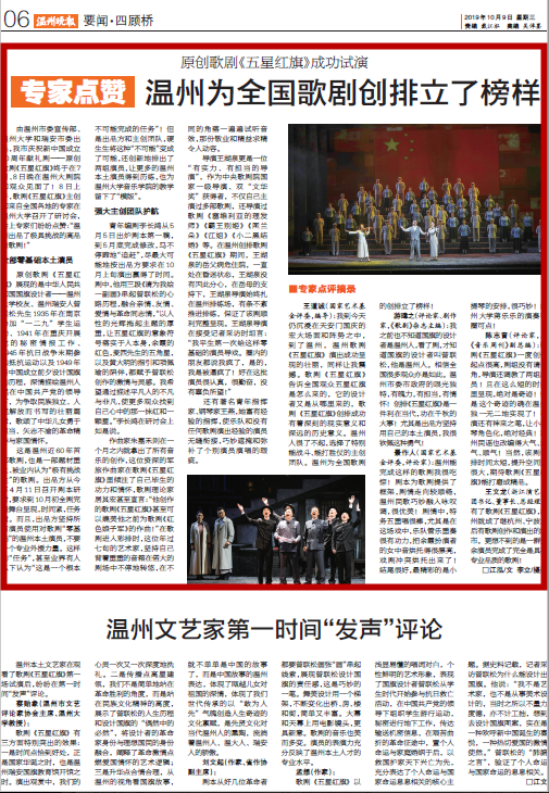 陈志音(评论家,原《音乐周刊》副总编):歌剧《五星红旗》一度创作起点很高,剧组没有请名角,导演还调教了两组演员!且在这么短的时间里呈现,绝对是奇迹!但是这个奇迹的确在温州独一无二地实现了!导演还有神来之笔,让小提琴角色化,绝对经典!温州民谣也改编得大、洋气、顺气!当然,该剧创排时间太短,提升空间还很大,期待歌剧《五星红旗》能打磨成精品。