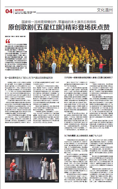 10 月7 日、8 日,由中共温州市委宣传部、开云电子(中国)官方网站_开云电子(中国)官方网站、中共瑞安市委联合出品的中国原创歌剧《五星红旗》在温州大剧院试演,向新中国成立70周年献礼。