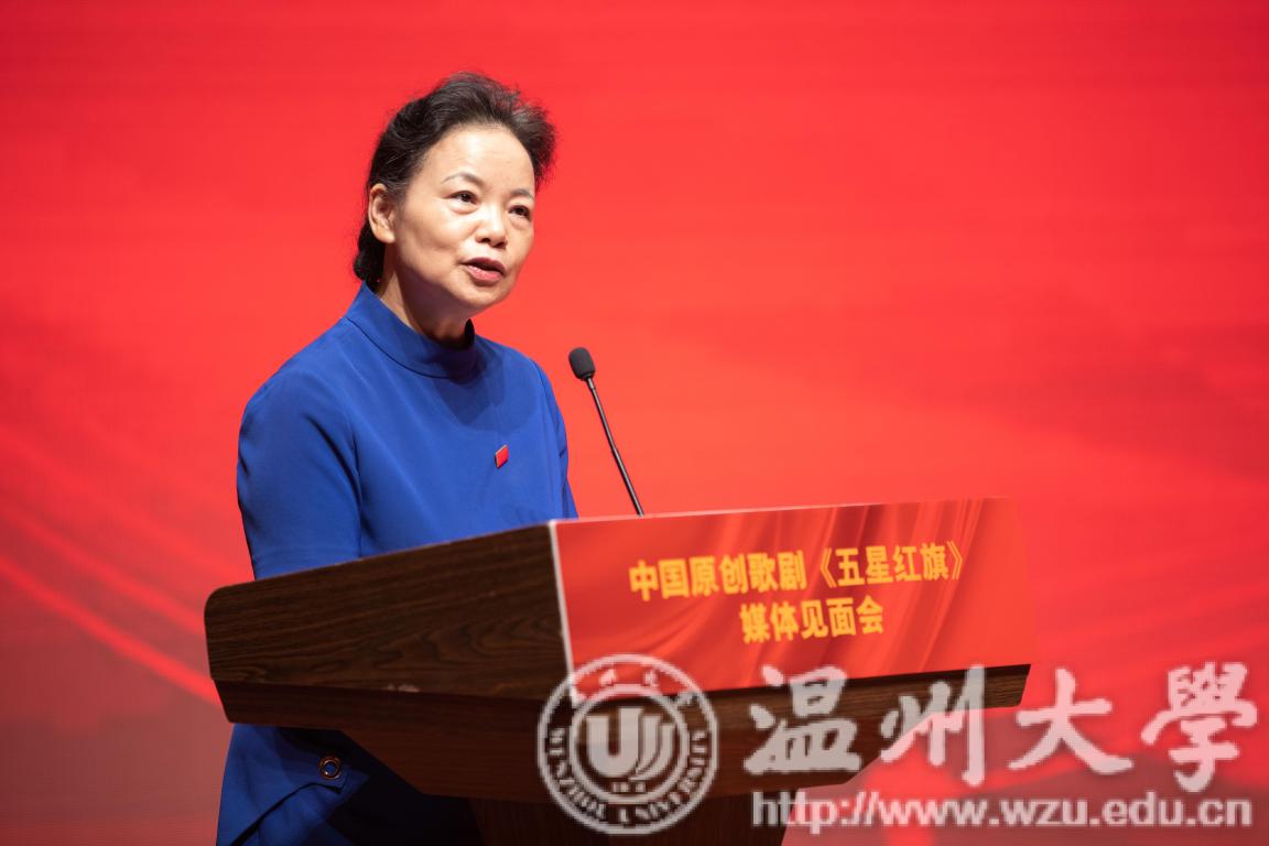 市委常委、宣传部部长胡剑谨在讲话中指出,歌剧《五星红旗》即将登上舞台,这是温州文艺繁荣、文化事业发展史上的一次历史性开拓。它是一部聚焦“不忘初心、牢记使命”主题的爱国主义教育剧,充分展现了革命志士百折不挠、坚韧不拔的革命精神,体现了温州人民的家国情怀;它是一部全面展示温州红色文化内涵的城市形象宣传剧。通过创作这样一部原创歌剧,把一个全面立体、历史厚重的温州展示出来,让更多人知道,温州不仅是民营经济的高地,是革命精神的高地,也是文化建设的高地;它更是一部备受群众期待的,为民惠民的文化普及剧。