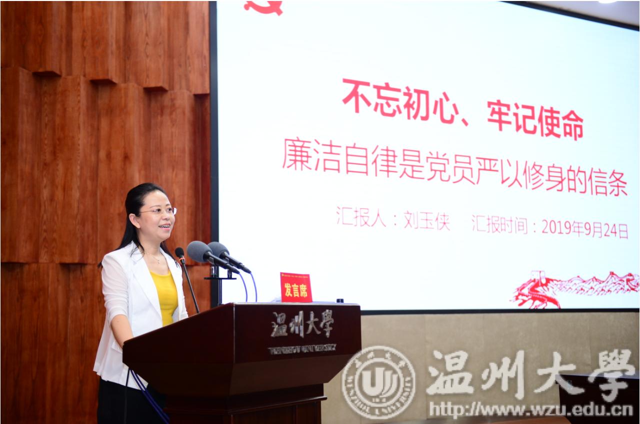 研究生院院长、学科建设办公室主任刘玉侠同志作题为《不忘初心、牢记使命:廉洁自律是党员严以修身的信条》的重点发言。她认为,党员、领导干部要在思想上建立“防火墙”、工作上设置“原则线”,坚守精神家园、守住政治生命线。