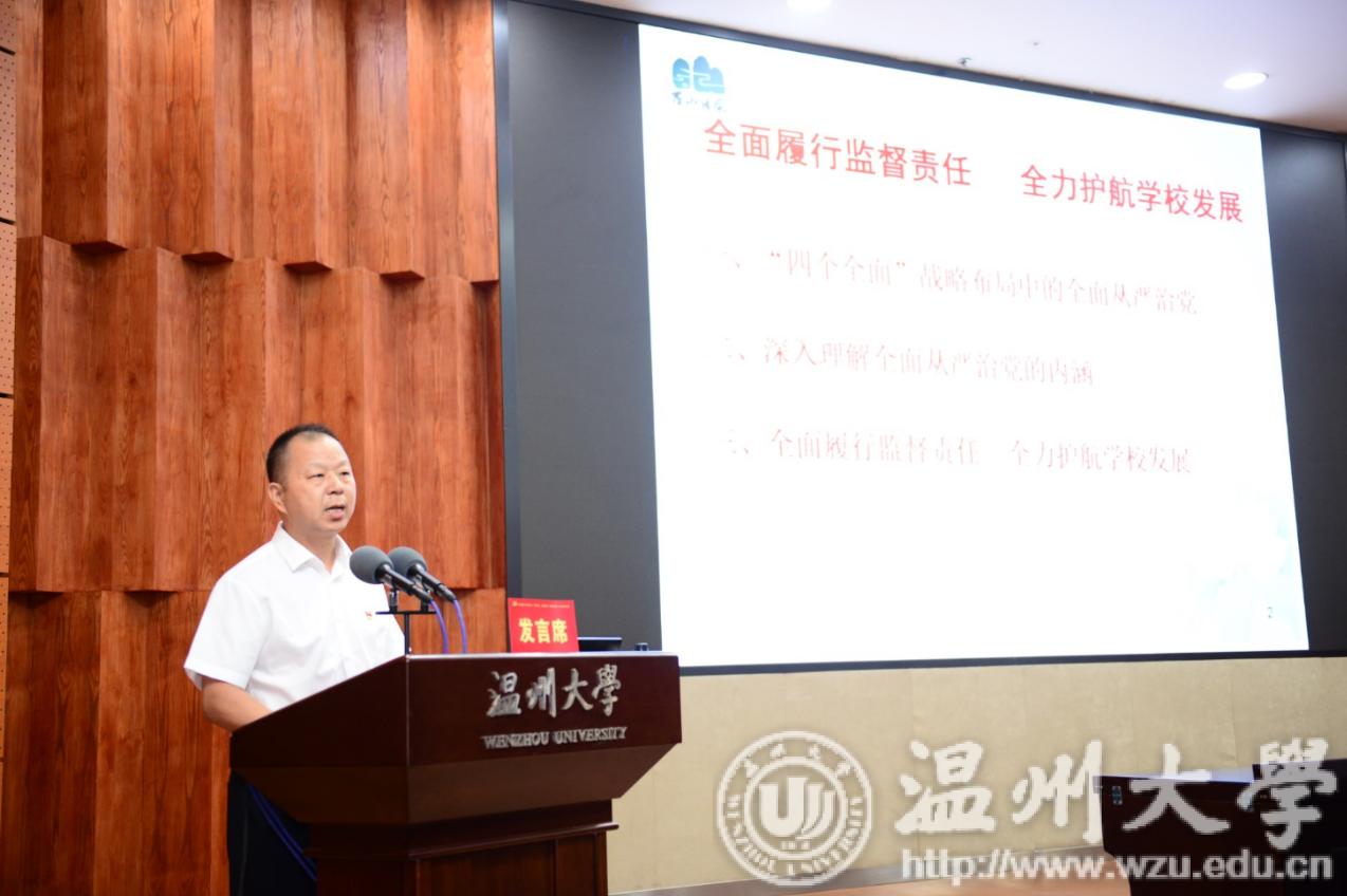 党委委员、纪委书记、监察专员吴金法同志作题为《全面履行监督责任,全力护航学校发展》的重点发言。他深刻分析了“全面从严治党”在“四个全面”战略布局中的重要地位,详细阐述了“全面从严治党”的深刻内涵,即核心是加强党的领导,基础在全面,关键在严,要害在治。结合学校的改革与发展实际,他认为强化政治监督、强化日常监督、强化执纪问责,是坚定不移推动学校全面从严治党向纵深发展的重要手段。