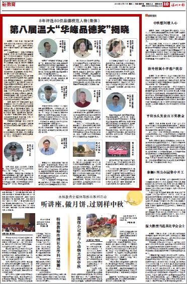 截至目前,“华峰品德奖”已评选出80位品德模范人物(集体),发出奖教金百万余元。这份品德的力量将永远激励着一代又一代的温大人。