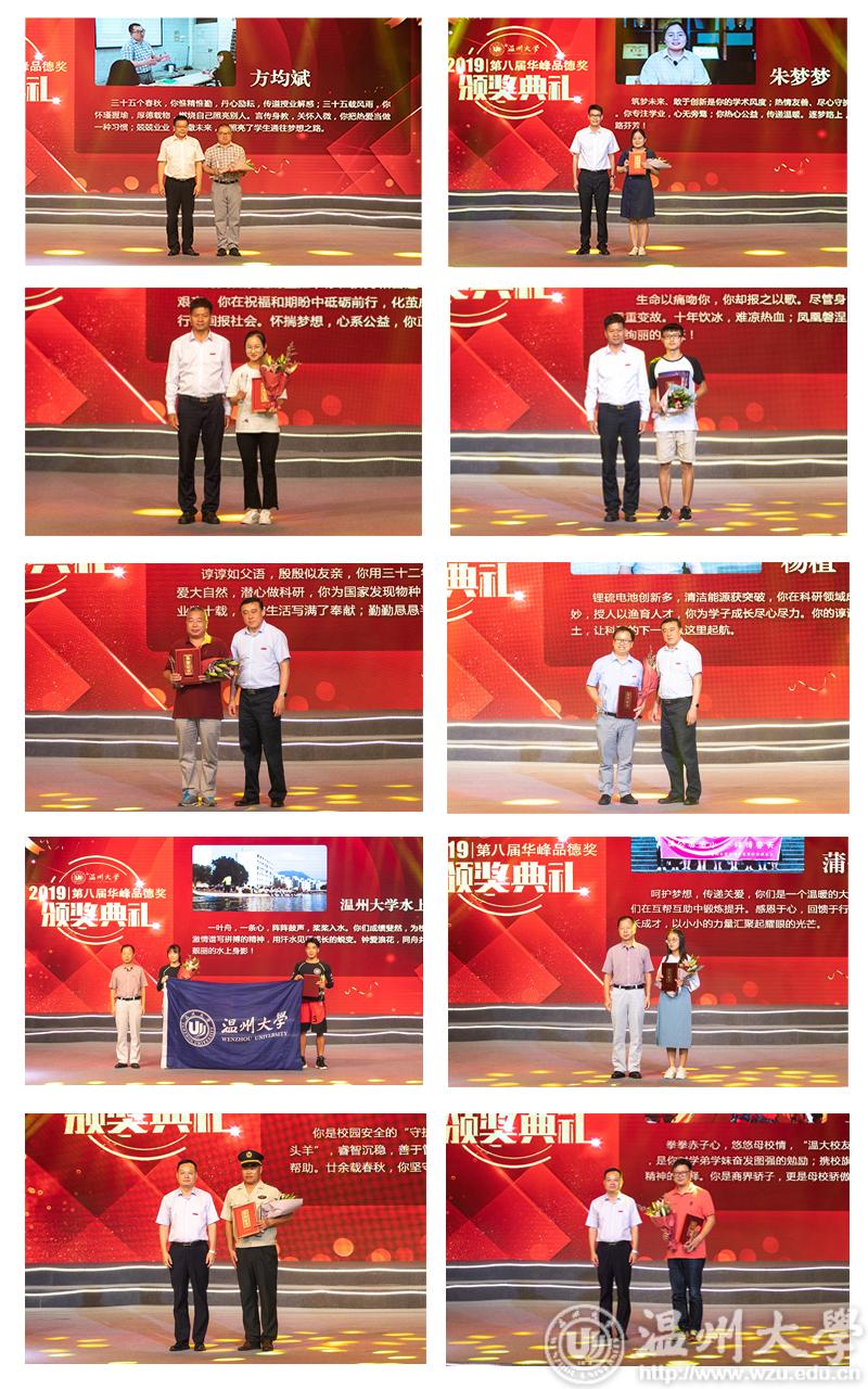 大会还共同分享了“第八届华峰品德奖”获得者的先进事迹。一群出身不同、经历各异的“温大人”,共同登上了领奖的舞台。他们分别是方均斌、朱梦梦、雷可宜、赵长丰、张永普、杨植、开云电子(中国)官方网站_开云电子(中国)官方网站水上运动队、蒲公英成长社、唐虎彪、王仲辉。这十位楷模中,有兢兢业业、爱岗敬业的教职员工,有品学兼优、自强不息的学子,有心系母校、时刻不忘传扬母校精神的优秀校友,有热心公益、传递关爱的志愿者团体,有激情拼搏、为校争光的运动队团体……他们在平凡中默默奉献、于无声处创造闪光价值,是学校践行社会主义核心价值观的旗手,激发出催人上进的道德力量,是当代温大最可爱的人!