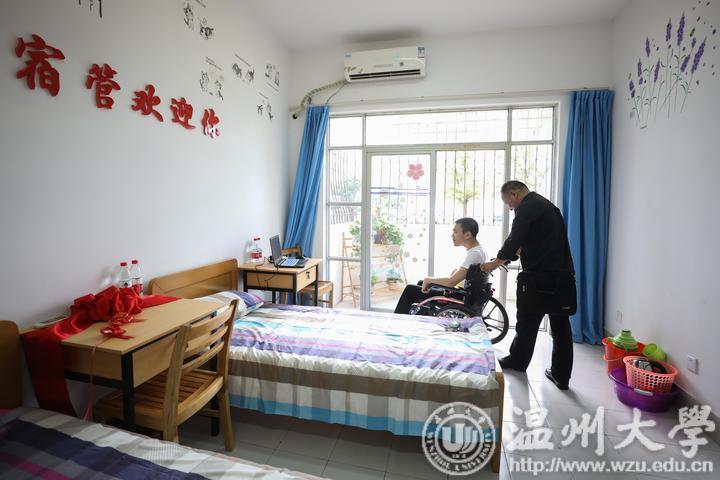 由于李新生活不能自理,父亲需要陪读,为此学校特地开设绿色通道,准备了一份特别的开学礼——为他量身定做了一间四年免费陪护单间宿舍,同时为了继续陪伴李新,曾高中同窗三年的小伙伴王锦涛也选择来温州医科大学读书……