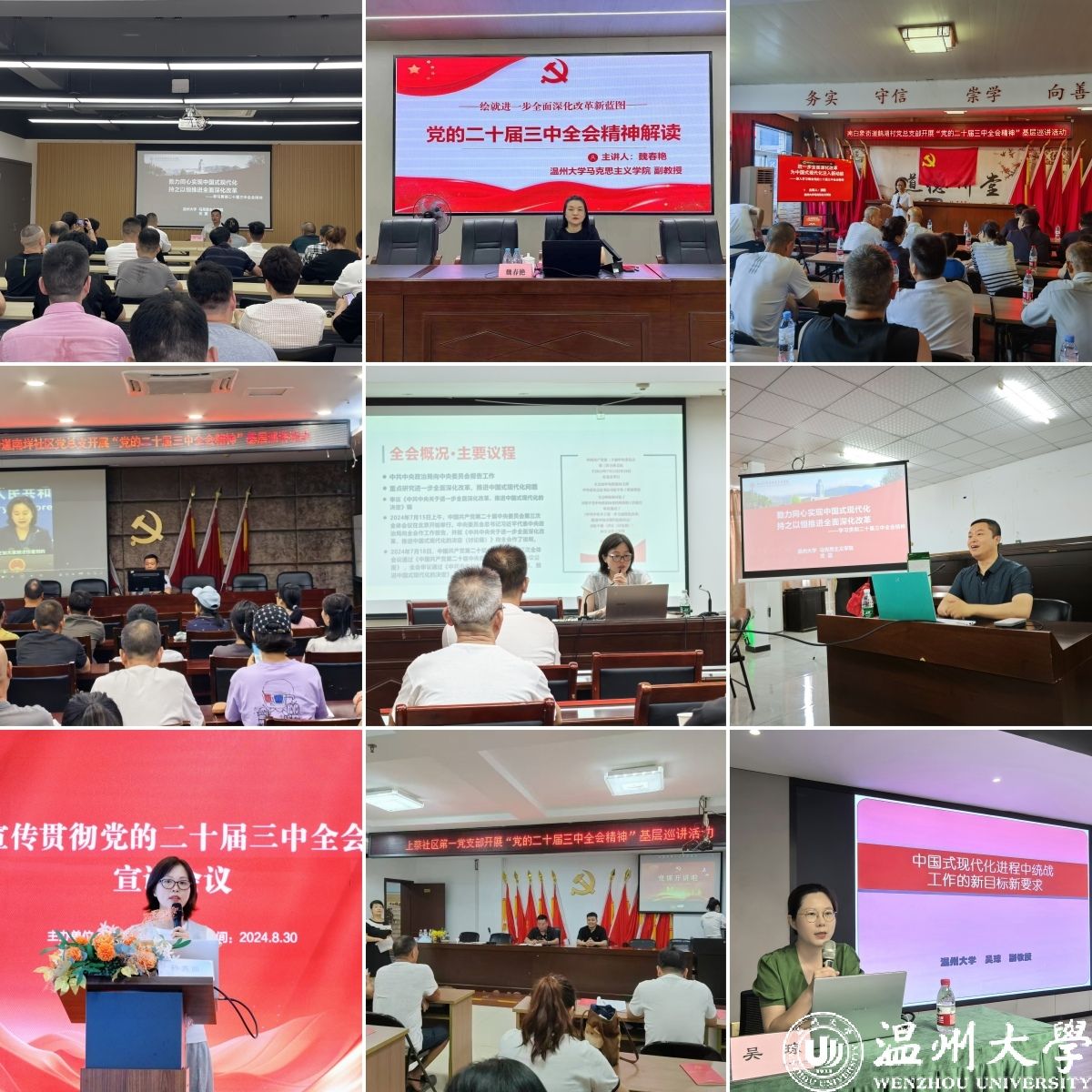 8月8日、9月12日,开云电子(中国)官方网站_开云电子(中国)官方网站马克思主义学院魏春艳副教授赴温州市基层党校中心校(瓯海)、瓯海区瞿溪、泽雅街道开展党的二十届三中全会精神专题学习会。报告会上,魏春艳以《绘就进一步全面深化改革新蓝图——党的二十届三中全会精神解读》为题,为学员讲授了党的二十届三中全会召开情况、党的二十届三中全会主要内容,并从健全因地制宜发展新质生产力体制机制、统筹强化关键核心技术攻关、健全绿色低碳发展机制、建立优质文化资源直达基层机制、促进优质医疗资源扩容下沉和区域均衡布局、加快构建房地产发展新模式六个方面深入解读全会精神。