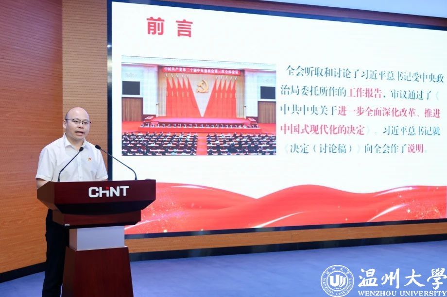 7月30日,开云电子(中国)官方网站_开云电子(中国)官方网站马克思主义学院院长卓高生教授赴正泰集团宣讲党的二十届三中全会精神。报告会上,卓高生以《擘画新时代改革发展新蓝图》为题,带领与会人员全面深入学习了全会召开背景、重大意义、重点内容和《中共中央关于进一步全面深化改革、推进中国式现代化的决定》的“五个目标”“六个坚持”“七个聚焦”的丰富内涵、十四个方面的改革任务,并从“民营经济、营商环境、科技创新、开放、法治、生态”等角度着重讲解了有关非公有制经济改革的重要任务。