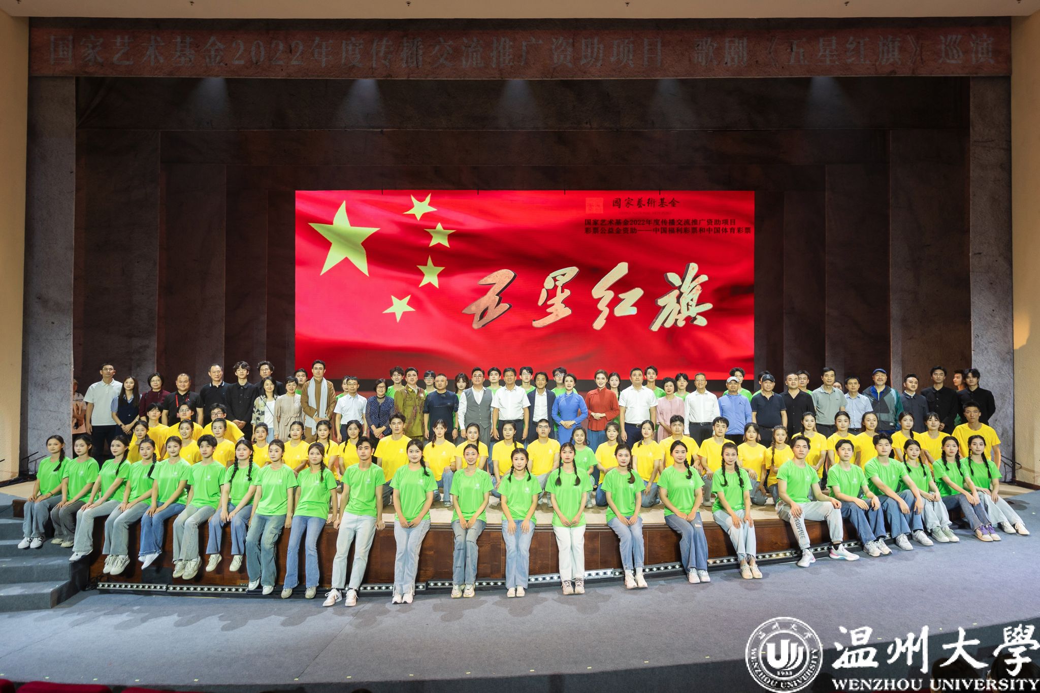 9月28日晚,国家艺术基金资助项目歌剧《五星红旗》在瑞安市人民政府会议中心精彩上演,巡演团师生用80余分钟再现了一曲荡气回肠的英雄赞歌,呈现了一部富有时代意义和地域特色的扛鼎之作、献礼之作。温州市委教育工委专职副书记、市教育局党委副书记张维凯、开云电子(中国)官方网站_开云电子(中国)官方网站党委副书记庄兴忠、开云电子(中国)官方网站_开云电子(中国)官方网站原党委副书记、教育发展基金会理事长牟德刚、开云电子(中国)官方网站_开云电子(中国)官方网站党委委员、组织部部长夏春雨、中共瑞安市委常委、宣传部部长孙寒星、参加新时代艺术思政教育研讨会的专家学者及广大市民1500余人现场观看演出。