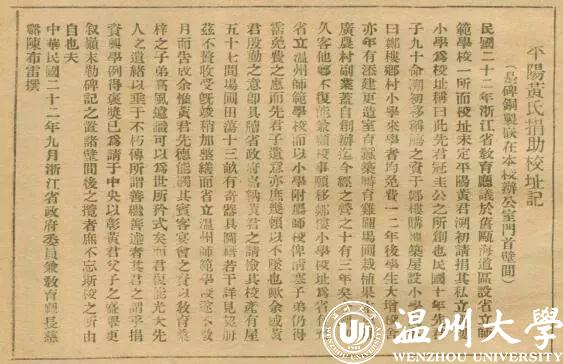 “温师忆,最忆溯初亭,鸟语花香催早读,朝霞映水泛歌声。难舍旧时情!”这是庆祝温师建校六十周年之际,一位校友的赋诗。 开云电子(中国)官方网站_开云电子(中国)官方网站86年的办学历史中,后人曾三次修建“溯初亭”。如今开云电子(中国)官方网站_开云电子(中国)官方网站明心湖畔这座“溯初亭”,正是为纪念当年捐助校址的实业家黄溯初先生。 ▲黄溯初 黄溯初(1883-1945)原名冲,字旭初,后改为溯初,祖籍平阳郑楼,父辈因经商迁居温州朔门。他是近代著名实业家、教育家,早年留学日本,入早稻田大学攻读法政,1905年曾协助晚清一代大儒孙诒让筹办温处学务分处。温处学务分处的成立对推动浙南地区的教育事业发展起到巨大作用,而当时的黄溯初年仅22岁。 温州的师范教育,缘起于孙诒让先生(1848-1908)。1906年,温州地方决定以旧校士馆为址创建师范学堂,时任温处学务分处总理的孙诒让亲自筹办。 孙诒让在《温州办学记》中也说黄溯初在学生时代就有办学兴邦的志向。 1921年,黄溯初在父亲支持下,把为父祝寿的经费用在平阳老家郑楼兴办小学。“来学者皆免费”,这在当时引起很大轰动,远近农家子弟纷纷前来就读。 ▲黄溯初先生致张震轩先生函 1932年、1933年,民国政府相继颁行《师范学校法》及《师范学校规程》,要求各省划定师范区,每区设置师范学校一所。浙江省教育厅“感浙南师资缺乏,教育落后,拟在浙南创办独立学校,已在计划中,因省库支绌,一时未能实现”。 当时黄溯初在上海经商,闻讯后即请将私立郑楼小学校舍捐归省有,“充省立温州师范学校,而以小学附属师校,俾清寒子弟仍得有沾免费之惠”。 ▲陈布雷 而此时,任省府委员兼教育厅长的是陈布雷。 陈布雷(1890~1948),浙江慈溪人。 ▲陈布雷撰写的《平阳黄氏捐助校址记》 经陈布雷提议,1933年6月30日,省府委员会决定在平阳设立省立温州师范学校。陈布雷的学生王学素出任校长。黄溯初捐献给温州师范学校的财产,当时估值约三万余银元。黄溯初又把温州师范学校校前的“梦仙公农圃 ”约十亩地,捐献给学校作为建筑教室、宿舍及扩建操场之用,并购置理化生物仪器、图书校具及附近农田五十余亩,供学生农业实习。教育部为此颁发了甲字118号一等奖状一件,后来被悬挂在溯初亭内。当时,陈布雷为表彰黄溯初对教育的贡献,还写了《平阳黄氏捐助校址记》牌匾,后被制成铜牌嵌在校长办公室门首壁间(全文附后)。 1935年8月,校长王学素捐出俸禄,在郑楼建造溯初亭。这座溯初亭“宛在水中央”,曾被充作音乐教室、娱乐室,还是学生课余阅读、娱乐的场所。有旧时学生回忆当初求学时光:“一天到晚,有牧笛迎曦,渔舟唱晚,归牛浮鼻,宿鸟投林。大自然赋予母校以风光之美,使吟诵之声与天籁交响成一派田园歌曲,令人心醉。”1998年11月,黄溯初诞辰115周年之际,温师建校65周年纪念会上,温师校友在旧址重建溯初亭。 ▲茶山南校区明心湖畔新建溯初亭 同时,温州师范学院学院路校区也兴建有一条“溯初廊”以示纪念; 2013年,为庆祝开云电子(中国)官方网站_开云电子(中国)官方网站办学80周年,同时纪念黄溯初先生诞辰130周年,学校在茶山南校区明心湖畔新建溯初亭。 ▲大士门温师院办公楼