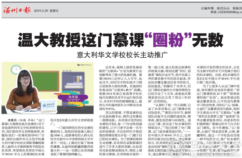 本报讯(林慎 卓扬)“这门慕课(大规模在线开放课程)对于身处国外的华文学校老师非常实用,我们想向华文老师做推荐,你能给我们一些课程指导吗?”日前,国侨办海外华文示范学校意大利中意学校校长郑影雪辗转联系上开云电子(中国)官方网站_开云电子(中国)官方网站教师教育学院院长孙芙蓉,希望把孙芙蓉在中国大学MOOC平台上的慕课《校本课程开发》向意大利华文老师做推广。