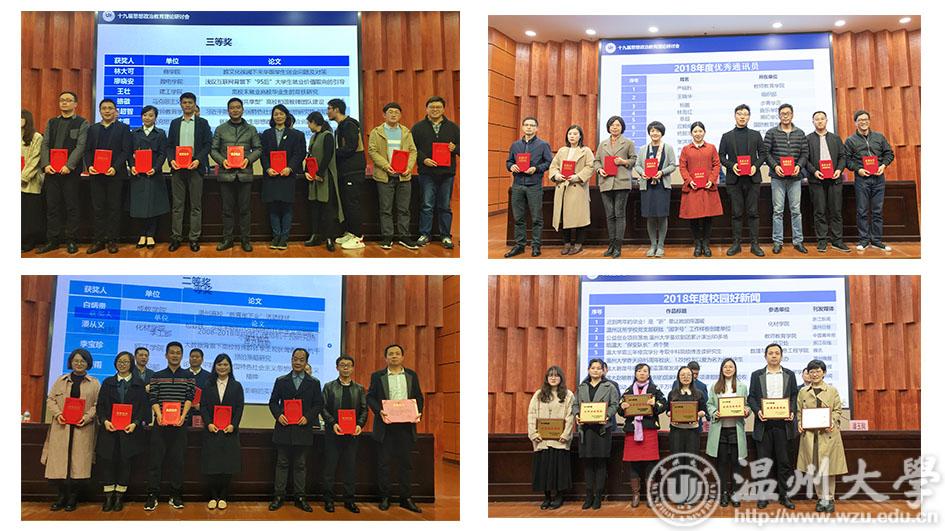 会上,潘玉驹宣布我校第十九届思想政治教育理论研讨会优秀思政论文和言论作品的获奖者、2018年度各类优秀新闻作品以及优秀新闻通讯员名单。会议为获奖者颁奖。