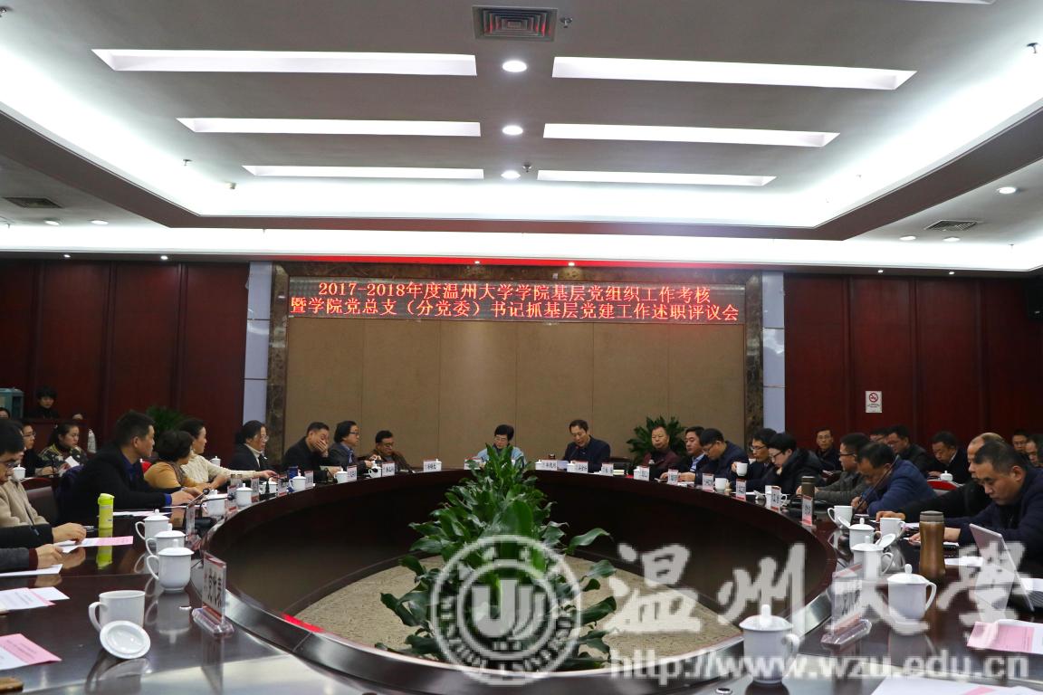 1月7日上午,我校2017-2018年度学院基层党组织工作考核暨学院党总支(分党委)书记抓基层党建工作述职评议会在南校岩松堂白鹿厅举行。校领导林娟娟、薛伟、吴金法、蔡曙光、钱强、潘玉驹出席会议,党群部门负责人、各党总支(分党委)书记、党代表、教代会执委和工会委员代表、一线教师代表和学生代表等共60余人参加会议并作测评,校党委副书记牟德刚主持。