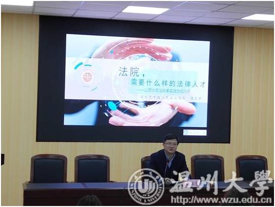会后,蒋卫宇为我校法学专业学生做了主题为“法院,需要什么样的法律人才”讲座。他结合个人学习和工作经历提出,法院需要的法律人应当要有法治情怀、有工匠精神、有社会经验、有跨界能力、有社会良知,勉励同学们坚定法律人的信仰和目标,好好学习,将来成为具有良善之心的好法官。