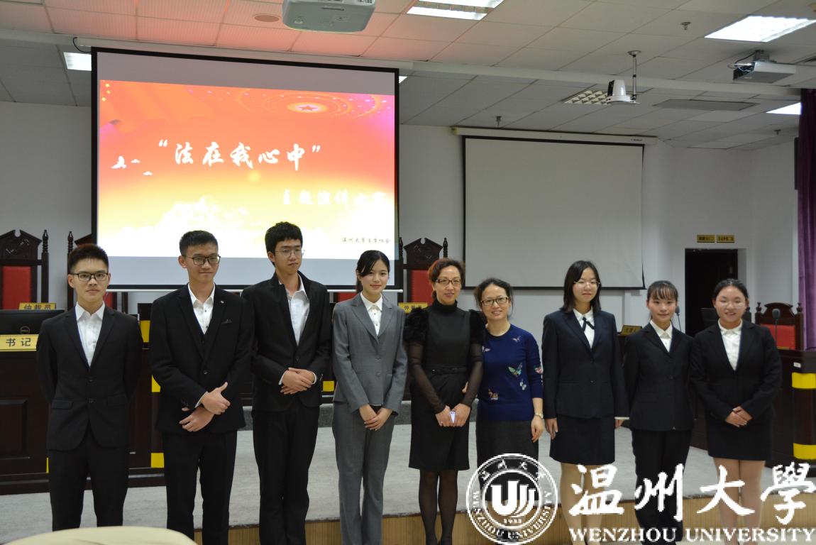 12月4日是国家宪法日,同时12月也是国家普法宣传月。在我国第五个国家宪法日来临之际,为弘扬法治精神,培育法治信仰,推动法治实践,凝聚全社会知晓、支持、参与法治建设的力量共识,繁荣校园文化,展示新时代大学生的青春风采,我校举办“法在我心中”主题演讲比赛,决赛在模拟法庭隆重开赛,由法政学院、校法学协会、法律援助工作站联合承办。法政学院党总支副书记严玲红老师、法学系副主任谢丽珍老师、学生科周骞老师担任此次比赛评委,决赛共有来自全校的11位选手参加。