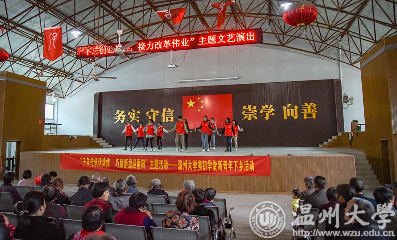 溯初学区师生志愿者赴乐清三界桥文化礼堂开展以“溯青新风尚,浓情迎重阳”为主题的新青年下乡活动,师生们为老人带去戏曲、剪纸、舞蹈等丰富多彩的节目。