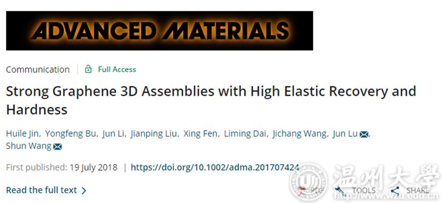 最近,我校化学与材料工程王舜课题组金辉乐博士在三维石墨烯方向取得研究新进展,研究成果以“Strong Graphene 3D Assemblies with High Elastic Recovery and Hardness”为题在线发表于《先进材料》(Advanced Material,2018,DOI: 10.1002/adma.201707424,影响因子21.95)。