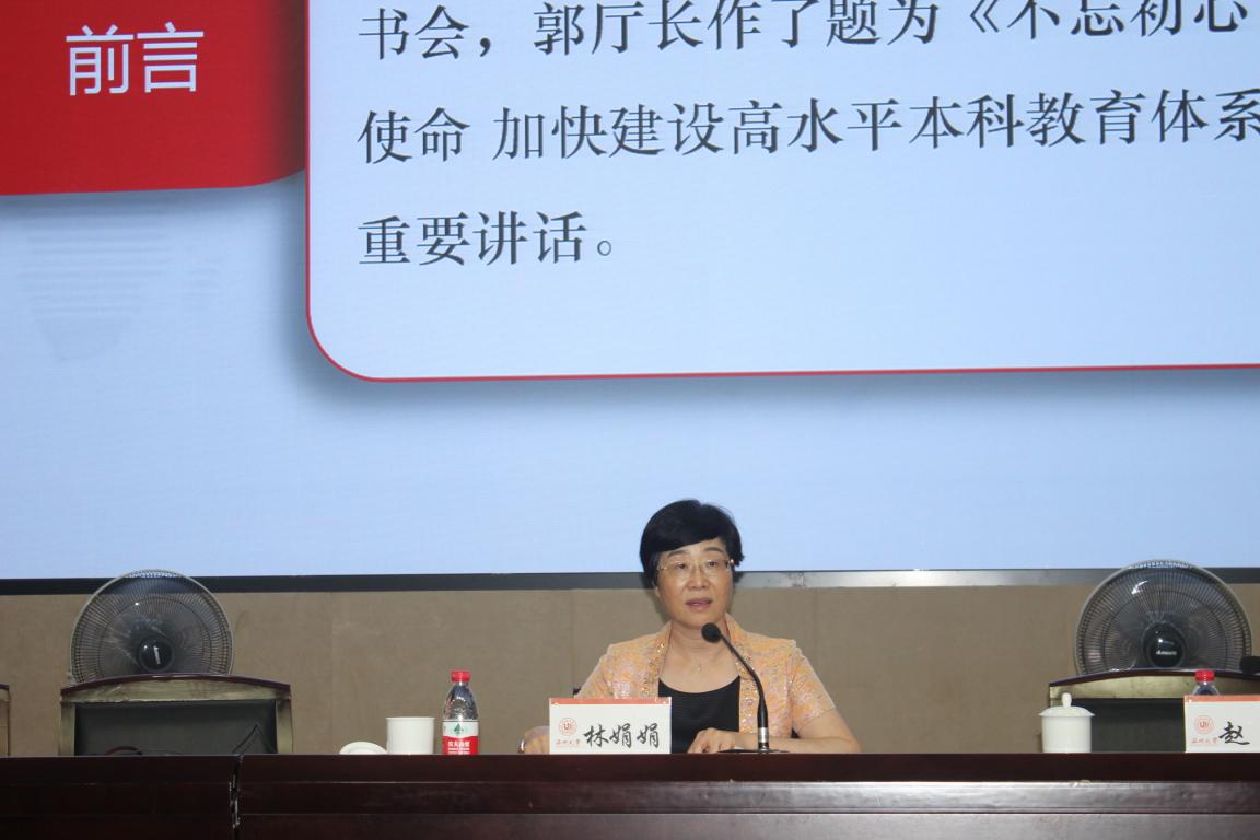林娟娟讲话。她指出今年的思政工作研讨会既是例会,也是立足新时代,着眼新目标,全面开启学校思想政治工作新征程的动员会、部署会。与会人员聚焦立德树人根本任务,总结工作、交流经验、分析形势、强化认识、明确目标,全力推进学校思想政治工作质量提升,充分体现了我校思政战线工作者的政治担当和职业操守。她着重传达了今年暑期全省本科高校党委书记校长读书会上郭华巍厅长的重要讲话精神,并就全面贯彻落实全国全省思政工作会议精神,进一步提升思政工作质量,提出新的希望、新的要求。她指出提升学校思政工作质量,必须牢牢把握“三个根本”问题。一是做好思政工作,必须肩负时代使命,狠抓立德树人,以全面坚持社会主义办学方向为根本遵循。为此,需抓住“四个着力点”:即力抓马克思主义理论教育、力践社会主义核心价值观、力行人才培养教育职能、力促大学校园和谐稳定。二是做好思政工作,必须健全体制机制,优化协同联动,以全盘构建人才培养的大思政体系为根本方向。为此,需着眼“五项工作”:即着眼思政课程和课程思政建设,畅通思政教育主渠道;着眼文化校园建设,唱响思政教育主旋律;着眼师德师风建设,铸强思政教育主心骨;着眼管理服务育人,坚定思政教育主阵地;着眼方式方法创新,把握思政教育主动权。三是做好思政工作,必须提升党建质量,强化政治引领,以全力加强党的全面领导为根本保证。为此,需做好“四个加强”:即加强学校党委领导责任,做到“高站位”;加强基层党组织政治功能,做到“俯下身”;加强党支部战斗堡垒作用,做到“立得稳”;加强思政干部队伍政治素质,做到“拿得起”。