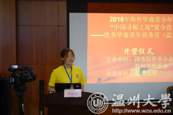来自西班牙的营员诸葛茜茜作为营员代表发言。她是一位生长于西班牙的华裔,13年的中文学习让她对中国文化产生了浓厚的兴趣。在发言中她用流利的汉语向主办方表达了感谢,也表达了自己对此次夏令营的期望,她希望能与来自各国的营员互动交流,呼吁大家相互帮助,相互学习,学到商务知识,更要认识中国、认识温州,体验中国文化。她的发言说出了广大营员们的心声。