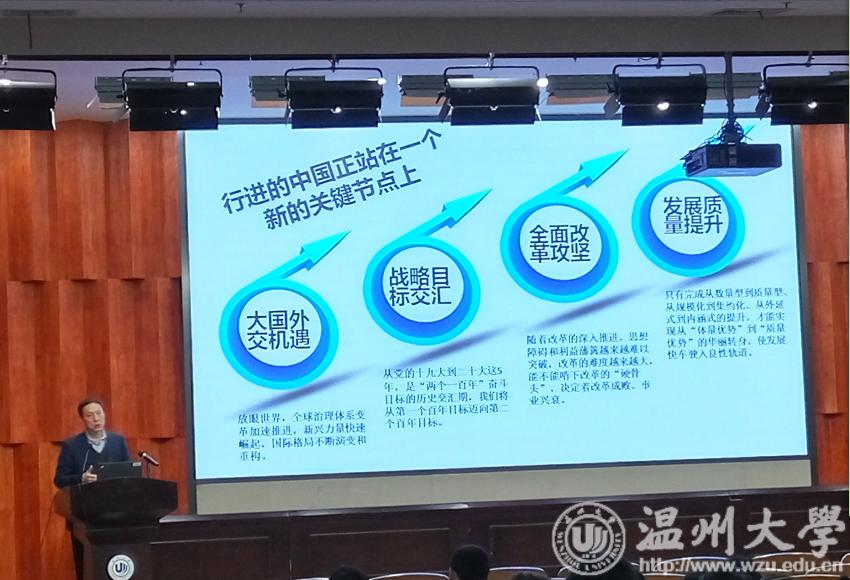 3月21日晚,南校岩松堂雁山厅座无虚席。我校开设的公选课《习近平新时代中国特色社会主义思想专题研究》课程开课,校党委副书记牟德刚带来第一讲——《习近平新时代中国特色社会主义思想》。300名通过网络选课的温大学子早早来到雁山厅,等待开讲。