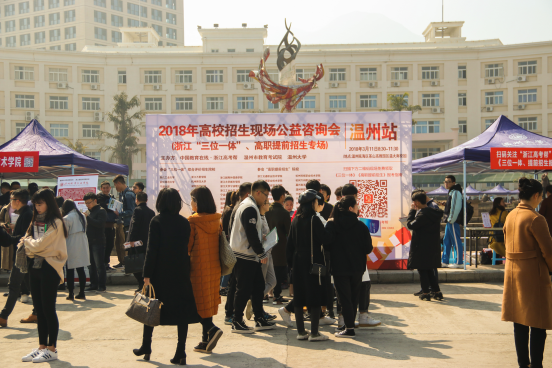 3月11日,距离高考不足100天。由我校承办的2018三位一体、高职提前招生咨询会(温州站)在南校区岩松堂喷泉广场举行。来自省内80余所高校招办负责人到咨询现场,与温州地区考生和家长进行交流。