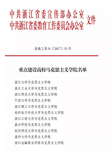 日前,中共浙江省委宣传部办公室,中共浙江省委教育工作委员会办公室发文公布全省重点建设马克思主义学院名单,确定我校和浙江大学等11所高校马克思主义学院作为重点建设单位。