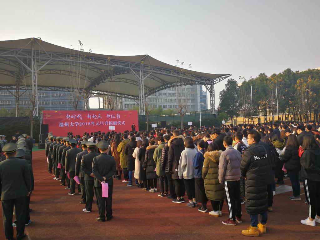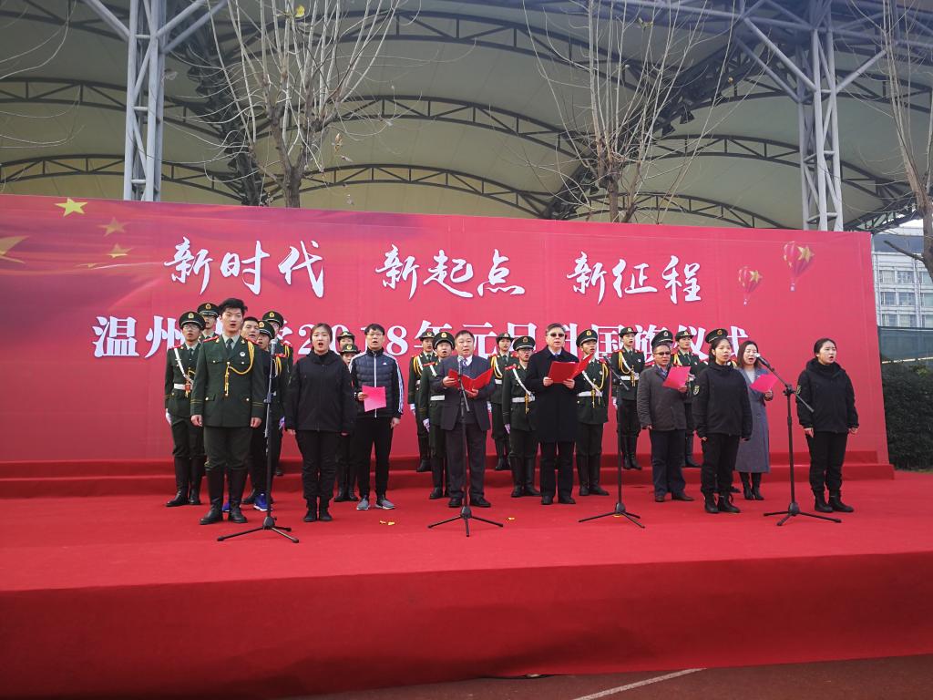 罗山迤逦,国旗巍巍。1月1日上午,我校北校区运动场举行以“新时代 新起点 新征程”为主题的升国旗仪式,在爱国熏陶中不忘初心,在辞旧迎新中砥砺前行。校长李校堃,学校相关部门负责人,步青学区、溯初学区、超豪学区和瓯江学院师生代表,全体校卫队队员、国旗护卫队队员、红锋CLUB退伍学生以及校友代表近500人参加了庄重的升旗仪式,党委副书记赵敏主持。