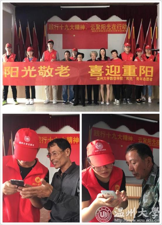 金秋十月,重阳节即将到来,为加强优良传统文化教育,践行党的十九大精神,着力推动社会主义核心价值观建设,积极响应学校深入实施“五爱”主题教育活动和“新青年下乡”活动。我校数信学院“阳光”青年志愿者以及数信学院党支部的志愿者们前往温州市鹿城区七都街道樟里村和板桥村开展“阳光敬老、喜迎重阳”优抚特别活动。 活动面向鹿城区七都社区樟里村和板桥村的优抚退伍老兵以及社区老人开展中医养生知识讲解、教授老人使用智能手机等敬老服务活动。为了使老人们的日常生活更加方便,志愿者们耐心地教授老人使用智能手机,为老人们解决了在使用手机方面的一些困惑,此外也教会了一些老人们关于使用微信、进行通讯的简单方法,整个活动过程非常热闹温馨。此外,鹿城区民政局和我校数信学院阳光青年志愿者还为优抚老兵送上真挚的祝福,老兵们纷纷表达了自己对党和国家社会的感激之情。 使命呼唤担当,责任引领未来。此次活动紧密贴合国家优抚政策,从优抚老人的身心健康需求出发,聆听优抚老人心声。志愿者们纷纷表示,身为新时代的青年大学生,每一个人都应该勇于担当,敬老爱老,并将这份传统、这份爱心不断地传承下去。