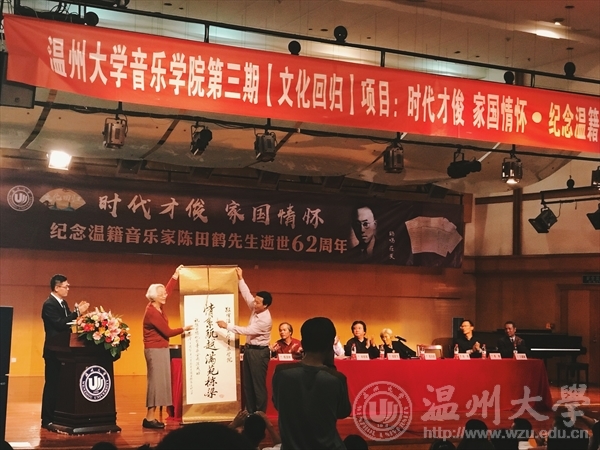 陈田鹤女儿陈晖用深情讲述了父亲的光辉音乐历程和丰富多彩的家庭生活。期间,她还展示了大量陈老年轻时的照片、学习工作情况,并向学校赠送题字“情系瓯越 满苑栋梁”。
