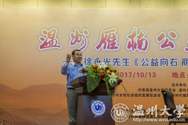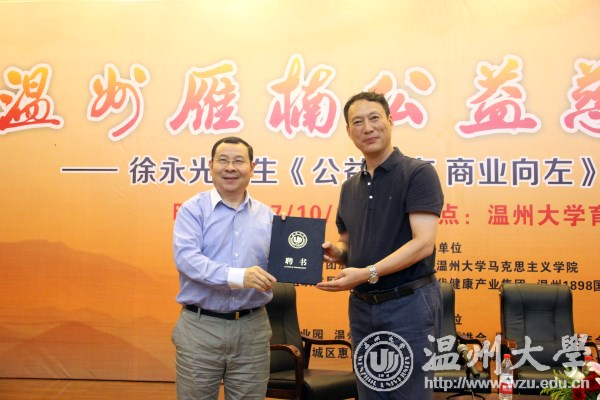 10月13日下午,由我校团委、马克思主义学院等单位联合举办的徐永光先生《公益向右 商业向左》新书专题分享会暨温州雁楠公益慈善论坛在我校育英图书馆学术报告厅举行。现场200多名学生及市民参加分享会。校党委副书记牟德刚到会致欢迎词并代表学校为徐永光先生颁发开云电子(中国)官方网站_开云电子(中国)官方网站兼职教授聘书。 徐永光先生系中国希望工程创始人、南都公益基金会理事长、国务院参事室特约研究员、中国慈善联合会副会长。在专题分享会上,他结合三个公益捐赠案例对公益慈善的本质和价值进行深入的剖析,指出公益是每个人的权利与选择,具有公益的纯经济价值、投资价值、社会创新价值和道德文化价值。未来互联网公益需要突破传统公益的局限,让公益组织在“鉴需”、“溯源”方便提升透明度、便捷性、选择性,并加强公益组织的信用认证与评估。他认为公益组织在社会创新过程中要提升有效性和精准化,要公益铺路、商业跟进、产业化扩张、可持续发展和有效解决社会问题。 分享会还邀请省内知名社会企业负责人、高校学者参与研讨。