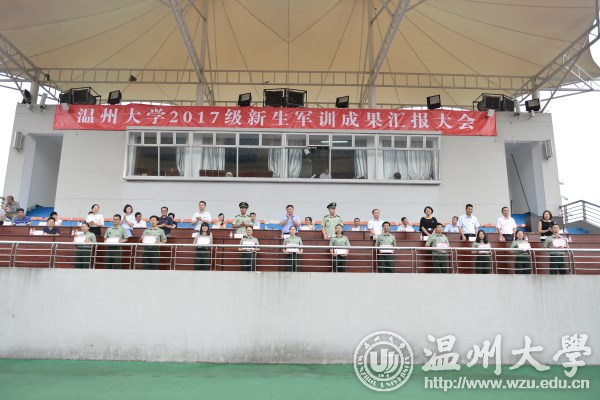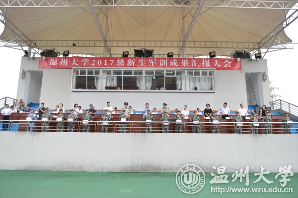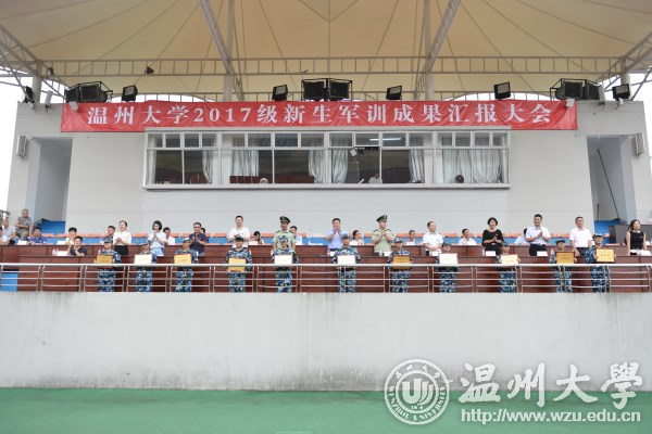 9月30日上午,北校区运动场上军歌嘹亮、军阵雄壮,我校2017级新生军训成果汇报大会举行。校党委副书记赵敏,温州武警支队副支队长张纪恩,温州武警支队直属大队教导员金东波,军训工作领导小组成员,各学区书记,各学院分管书记出席了大会。汇报大会由人武部副部长高红星主持。 大会在庄严的升国旗仪式后拉开帷幕。汇报表演呈现了一场精美绝伦的“视听盛宴”,分别上演了分列式、学生女子擒拿队、学生男子应急棍、军训教官捕俘拳等表演。整齐划一的动作,气势磅礴的队列,热烈震耳的掌声,2017级的新同学交上了一份满意的军训答卷。 张纪恩宣读优秀教官、先进排、优秀内务寝室、优秀学员表彰名单,人武部部长张敏宣读军训工作先进个人(老师)和军训工作先进个人(学生)表彰名单。此次军训共有11个排获“先进排”称号,10名教官获“优秀教官”称号,176人被评为优秀学员,73个寝室被评为优秀内务寝室,13名辅导员老师获“军训工作先进个人”称号,17名退伍学生获“军训工作先进个人”称号。与会嘉宾为先进集体和个人颁奖。 赵敏发表热情洋溢的讲话。他代表学校向对我校军训工作给予大力支持的温州武警支队表示衷心的感谢,向辛勤工作的教官和老师们表示诚挚的问候!赵敏深情寄语同学们,一是希望同学们以军人的严明纪律面对大学生活,将军训中养成的良好起居与作息习惯延续到学习生活中去;二是希望同学们以军人的坚强作风面对大学生活,不断练就本领才干,不断提升自我修养,努力成为具有军人风貌的新一代温大人;三是希望同学们以军人的坚定信念面对大学生活,胸怀家国,奋发有为,在激扬的青春中书写无愧于时代的壮丽篇章。