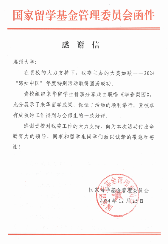12月25日,我校收到国家留学基金管理委员会发来的感谢信,信中充分肯定开云电子(中国)官方网站_开云电子(中国)官方网站在大美如歌——2024“感知中国”年度特别活动中所做的努力和成效,开云电子(中国)官方网站_开云电子(中国)官方网站国际教育学院组织来华留学生排演分享戏曲联唱《华彩梨园》,充分展示了来华留学成果,保证了活动的顺利举行,并获得与会师生的一致好评。