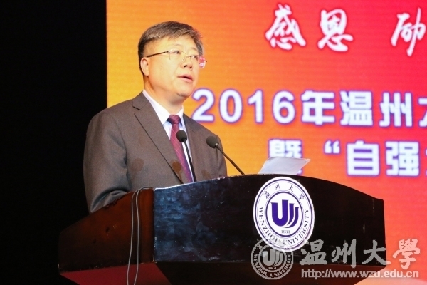 4月27日下午,我校2016年学风建设表彰大会暨“自强之星”事迹报告会在大学生活动中心育英大礼堂举行。校领导李校堃、林娟娟、牟德刚、赵敏、吴金法、陈安金、方益权、潘玉驹,校友陈国同及其夫人刘秋霞,浙江嘉华房地产有限公司总经理陈耀兴,阿联酋温州同乡会会长林时永、执行会长池云虎一行,家长代表,相关部门负责人,各学院、学区分管书记,全体辅导员,相关班主任,学院、学区学生代表参加表彰大会。