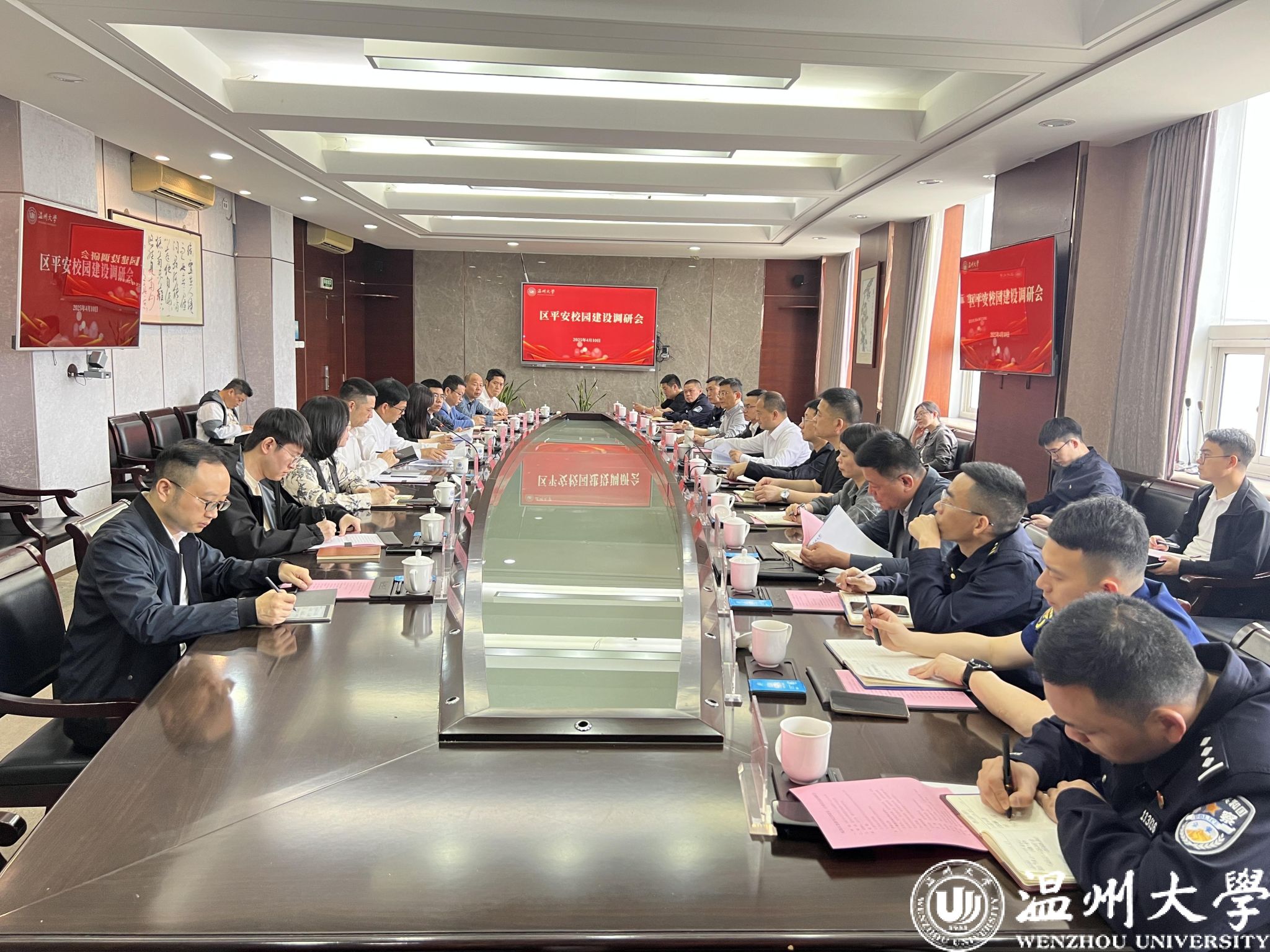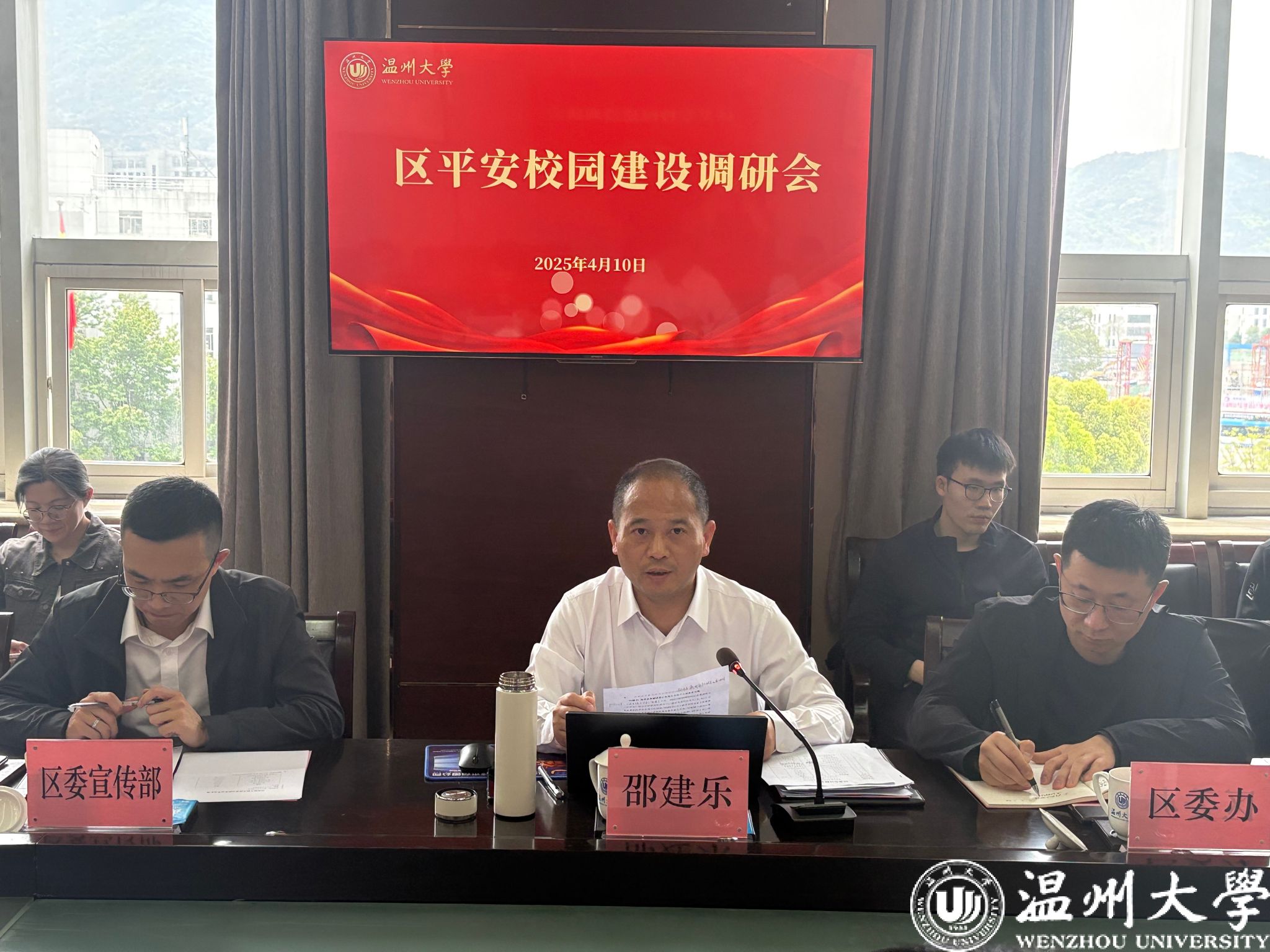 4月10日上午,瓯海区委副书记邵建乐一行来我校专题调研平安校园建设工作。校党委副书记庄兴忠主持会议,党委委员、宣传部部长、统战部部长吴静,党校办、学工部、保卫部等相关部门负责人参会交流。