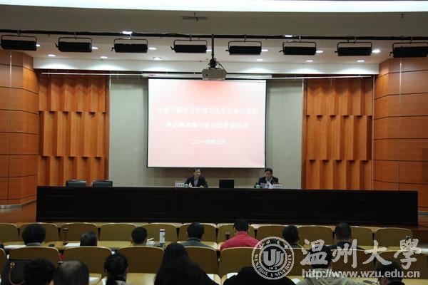 3月20日上午,我校中层干部学习习近平总书记系列讲话精神集中轮训班在会展中心雁山厅开班。 校党委书记陈福生出席开班仪式并讲话。 陈福生对学校中层干部学习贯彻习近平总书记系列讲话精神集中轮训工作作了全面部署并提出明确要求。他指出,要充分认识深入学习贯彻习近平总书记系列讲话精神的重大意义,切实增强学习贯彻的自觉性主动性;要全面领会习近平总书记系列讲话精神的丰富内涵,积极有为地推进学校各项事业科学发展;要真正学懂学透习近平总书记系列讲话精神,以良好的学风把学习贯彻讲话精神引向深入。 陈福生强调,全校中层干部要通过集中培训,进一步领会习近平总书记系列讲话精神的实质,做到系列讲话精神入耳、入脑、入心,真正做到学有所思、学有所悟、学有所获、学以致用,积极主动投身到推动学校深化体制机制改革,牢牢把握改革的正确方向,完善学校内部治理体系,调整优化办学结构,提升师资队伍水平,增强学科核心竞争力、创新人才培养模式,提升服务社会水平,推进学校内涵式发展。 开班仪式后,浙江理工大学原法政学院院长谭劲松教授,浙江工业大学党委委员、宣传部部长李昌祖教授,浙江工商大学原党委副书记廖曰文教授,浙江师范大学教育评论研究中心主任刘尧教授等分别作题为以“‘十八届三中全会’精神解读”、“学习习近平总书记关于宣传意识形态工作讲话精神,加强和改进高校思想政治教育”、“学习习近平总书记关于党的建设讲话精神,全面提高高校党建工作科学化水平”、“全面深化教育体制综合改革,推进大学内涵建设”的专题辅导报告,并观看视频学习中央党校研究生院院长韩庆祥的“新一届中央领导集体治国理政总体思路的哲学梳理”专题报告。 根据省委教育工委的总体部署和统一安排,我校中层干部学习贯彻习近平总书记系列讲话精神集中轮训通过专题讲座、分组研讨、观看纪录片、在线学习和总结考核等环节,分专题、有重点地进行理论辅导和专题研讨,做到真学真懂、真信真用、真抓真干,努力为办人民满意的教育提供坚强保障。