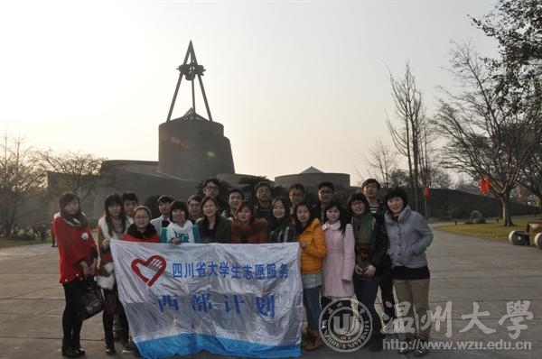 在四川省罗江县参加四川地震灾后重建的志愿者们。志愿者们参观三星堆。我校西部支教志愿者柳青菲和学生们在一起。