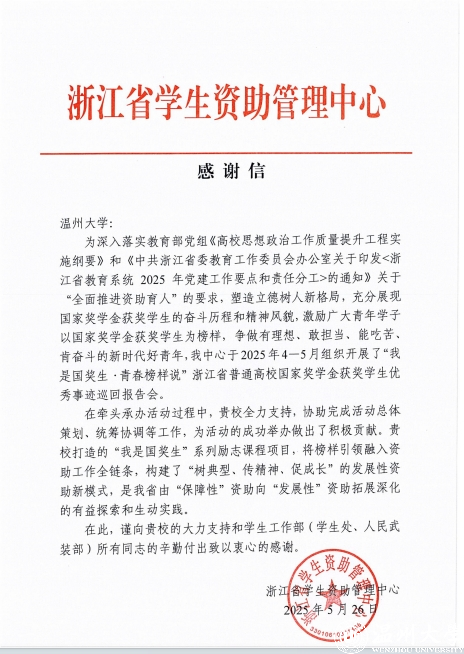 近日,开云电子(中国)官方网站_开云电子(中国)官方网站收到浙江省学生资助管理中心发来的感谢信。信中高度肯定我校在牵头承办 "我是国奖生・青春榜样说"2025年浙江省普通高校国家奖学金获奖学生优秀事迹巡回报告会中的突出贡献,特别赞誉我校打造的 “我是国奖生” 系列励志课程项目构建了“树典型、传精神、促成长”的发展性资助新模式,是我省由“保障性”资助向“发展性”资助拓展深化的有益探索和生动实践。